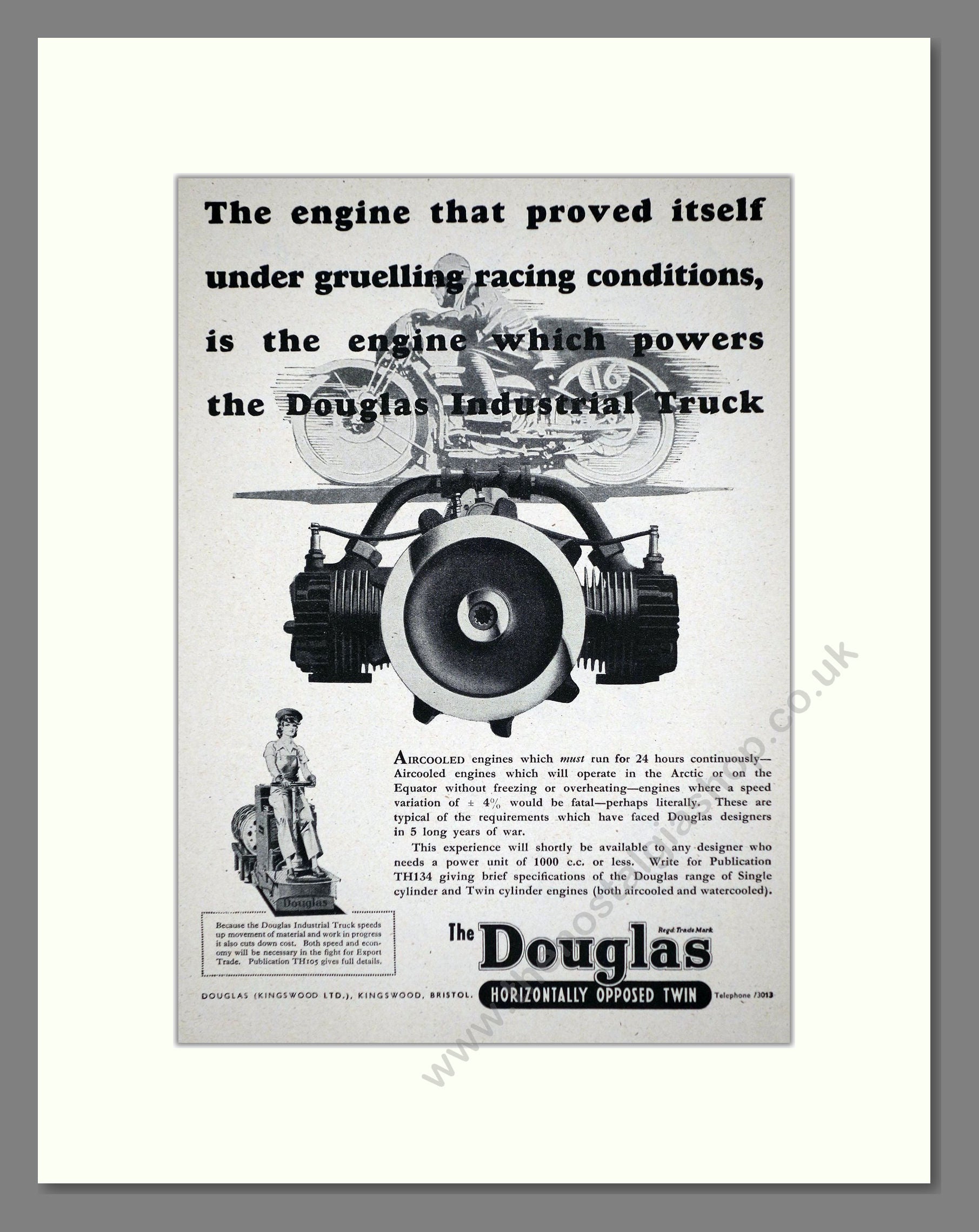 Douglas - Industrial Truck. Vintage Advert. This is a classic original advert from 1945. Presented and supplied in a cream bevel cut mount with backing card and clear bag. Ready to fit in a 14 x 11 inches frame. The mounted advert will be posted via courier and well packed - protected with a sheet of hardboard to keep it rigid. Any questions or enquiries, please get in touch, we are here to help! All our adverts, unless clearly stated are originals from the date shown. They make excellent pieces of wall art and stunning gifts. Many are rare and hard to find and once sold, may not be replaced. Remember you are buying a piece of history. Website watermark is not on original.