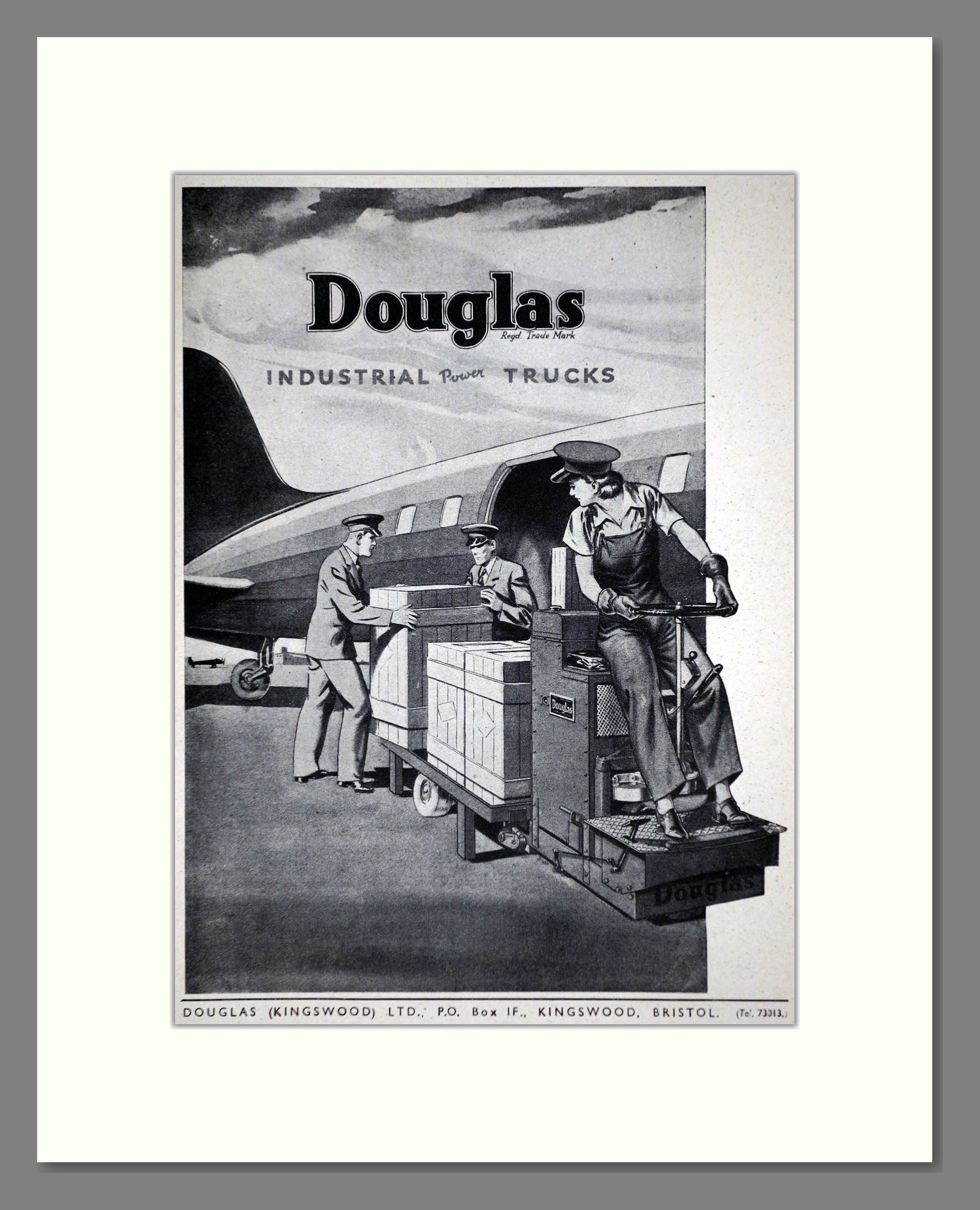 Douglas - Industrial Trucks. Vintage Advert. This is a classic original advert from 1944. Presented and supplied in a cream bevel cut mount with backing card and clear bag. Ready to fit in a 14 x 11 inches frame. The mounted advert will be posted via courier and well packed - protected with a sheet of hardboard to keep it rigid. Any questions or enquiries, please get in touch, we are here to help! All our adverts, unless clearly stated are originals from the date shown. They make excellent pieces of wall art and stunning gifts. Many are rare and hard to find and once sold, may not be replaced. Remember you are buying a piece of history. Website watermark is not on original.