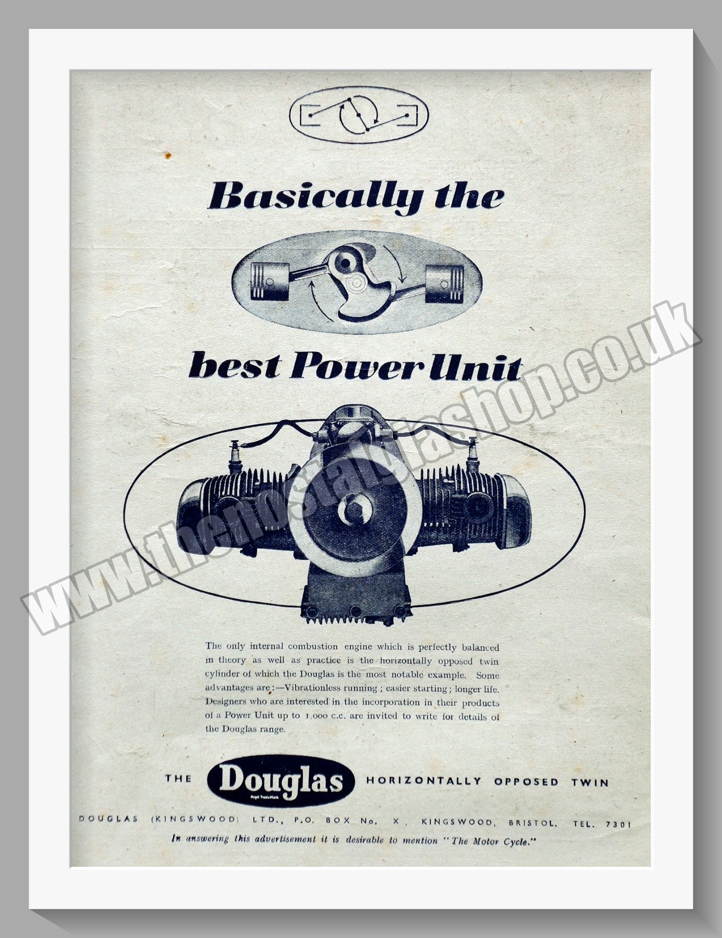 Douglas Motor Cycles. Horizontally Opposed Twin Twin. Original advert from 1945. Presented and Supplied in a cream bevel cut mount with backing board and Clear Bag. Made to fit straight into 14x11 inch frame. The perfect gift. These adverts are all Originals from the dates stated. They are NOT modern reprints. Many are difficult to get hold of , some are very rare and once sold may not be replaced, Remember, you are buying a piece of historic nostalgia. Lots more adverts available. Please contact us if you don't see the advert you want. Website watermark not on Advert.
