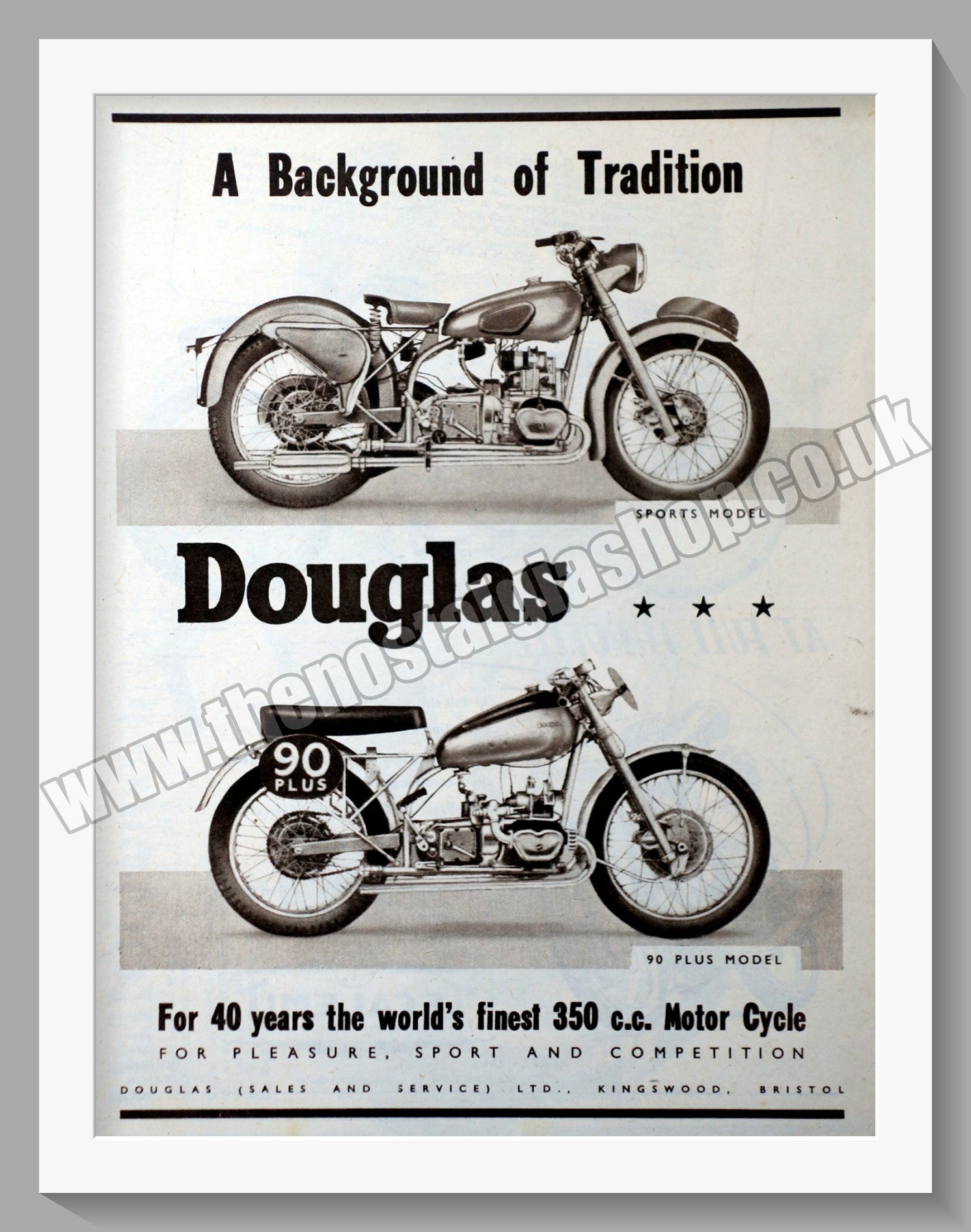 Douglas Motor Cycles. Douglas 40 years of the world's finest 350cc. Original advert from 1950. Presented and Supplied in a cream bevel cut mount with backing board and Clear Bag. Made to fit straight into 14x11 inch frame. The perfect gift.- These adverts are all taken from Original publications of the dates stated. They are NOT modern reprints. Many are difficult to get hold of , some are very rare and once sold may not be replaced, Remember, you are buying a piece of historic nostalgia. Lots more adverts available. Please contact us if you don't see the advert you want. Website watermark not on Advert.