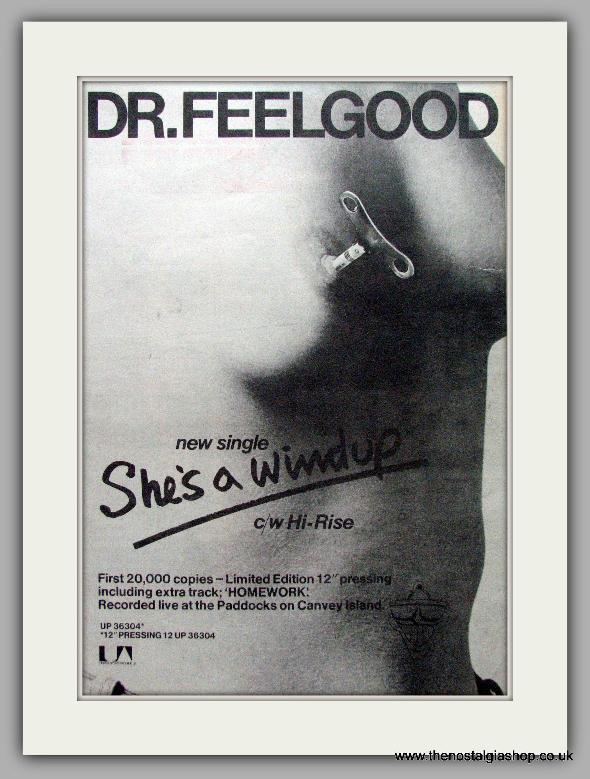 Dr. Feelgood. She's a Windup. Vintage Advert 1977 (ref AD9589). Presented and supplied in a cream bevel cut mount with backing card and clear bag. Ready to fit in a 20x16 inch frame. The mounted advert will be posted via courier and well packed - protected with a sheet of hardboard to keep it rigid. Any questions or enquiries, please get in touch, we are here to help! All our adverts, unless clearly stated are originals from the date shown. They make excellent pieces of wall art and stunning gifts. Many are rare and hard to find and once sold, may not be replaced. Remember you are buying a piece of history. Website watermark is not on original.