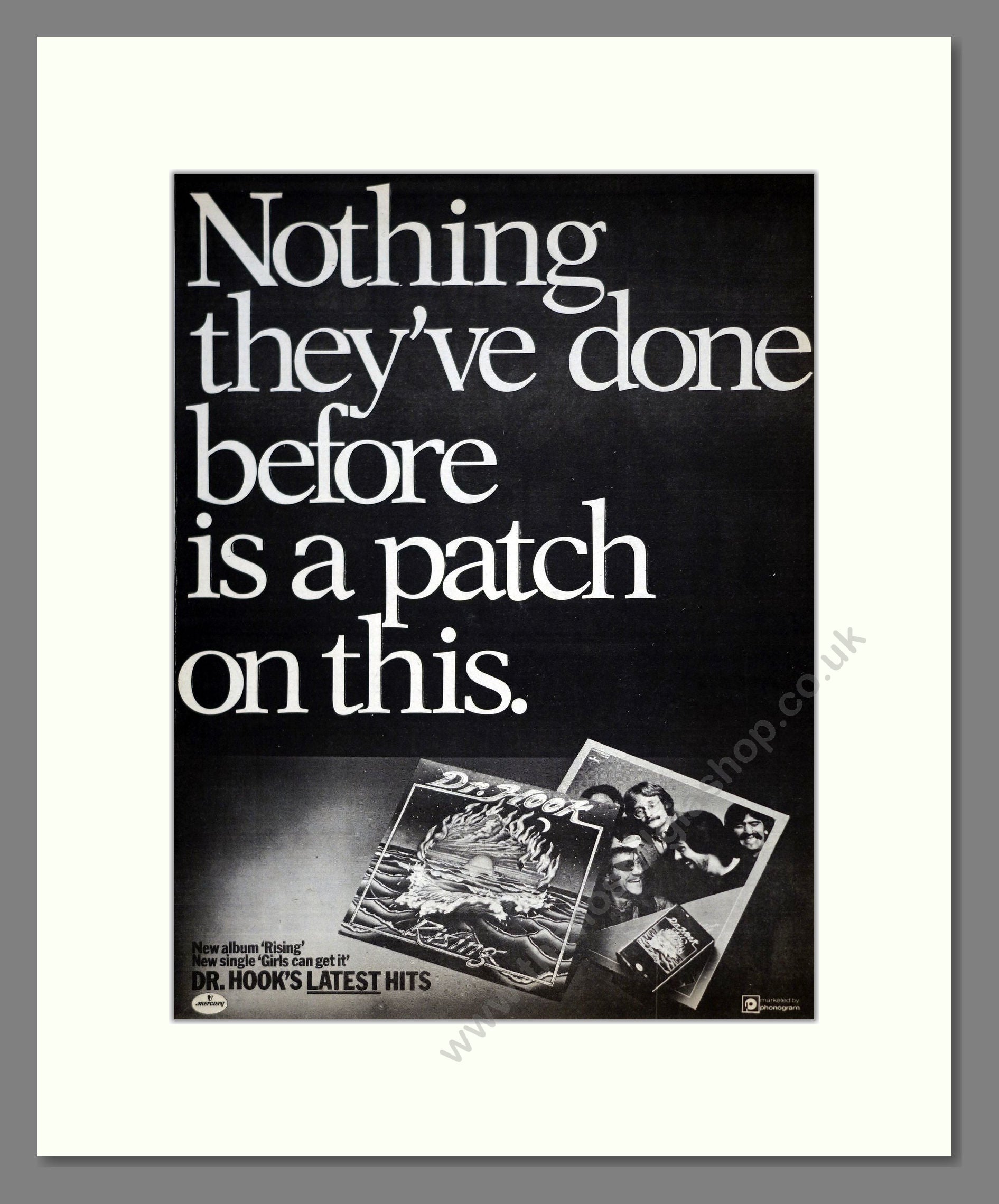 Dr Hook - Latest Hits. Vintage Advert. This is a large classic original advert from 1980. Presented and supplied in a cream bevel cut mount with backing card and clear bag. Ready to fit in a 20 x 16 inches frame. The mounted advert will be posted via courier and well packed - protected with a sheet of hardboard to keep it rigid. Any questions or enquiries, please get in touch, we are here to help! All our adverts, unless clearly stated are originals from the date shown. They make excellent pieces of wall art and stunning gifts. Many are rare and hard to find and once sold, may not be replaced. Remember you are buying a piece of history. Website watermark is not on original.