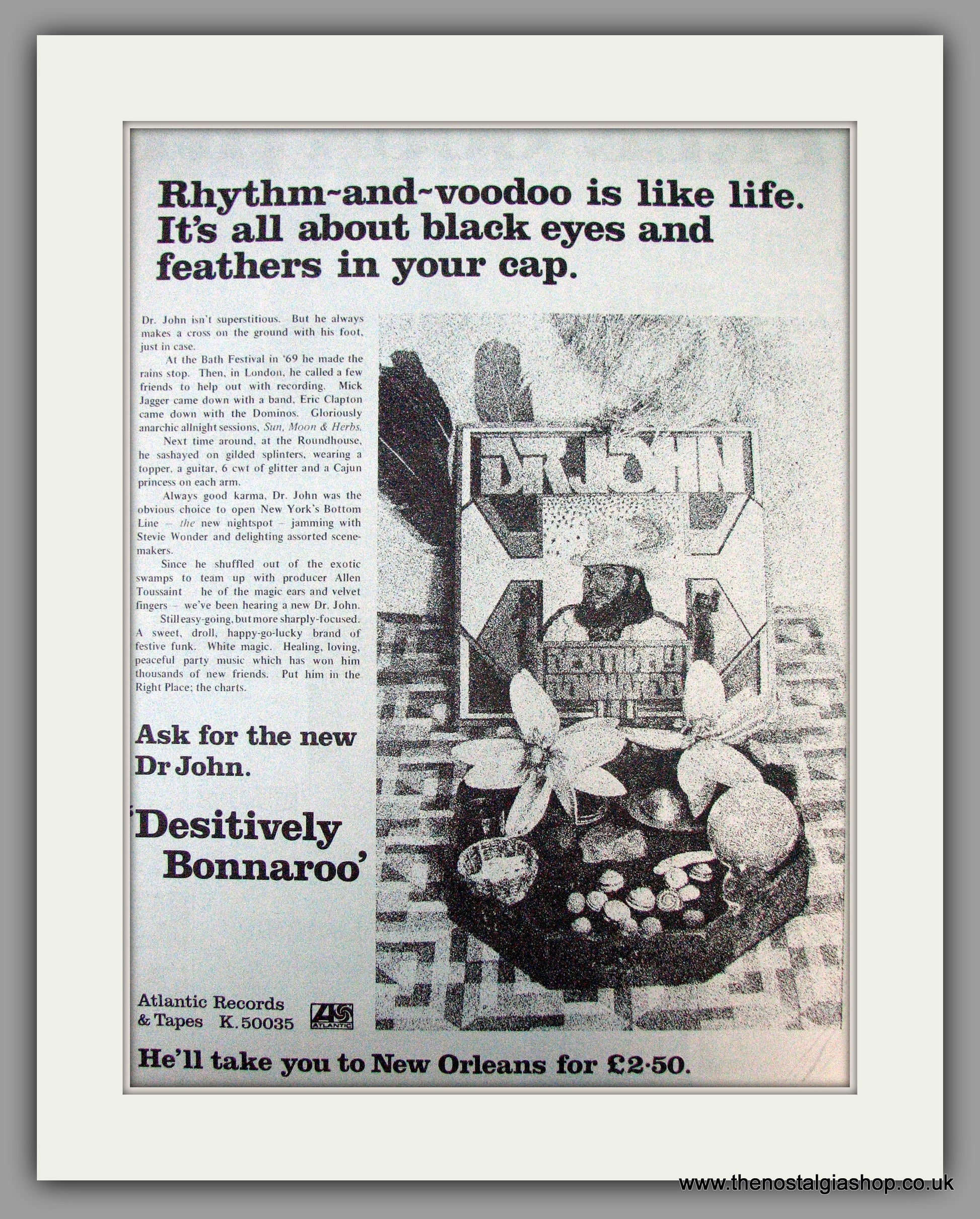 Dr. John. Desitively Bonnaroo. Vintage Advert 1974 (ref AD9736). Presented and supplied in a cream bevel cut mount with backing card and clear bag. Ready to fit in a 20x16 inch frame. The mounted advert will be posted via courier and well packed - protected with a sheet of hardboard to keep it rigid. Any questions or enquiries, please get in touch, we are here to help! All our adverts, unless clearly stated are originals from the date shown. They make excellent pieces of wall art and stunning gifts. Many are rare and hard to find and once sold, may not be replaced. Remember you are buying a piece of history. Website watermark is not on original.