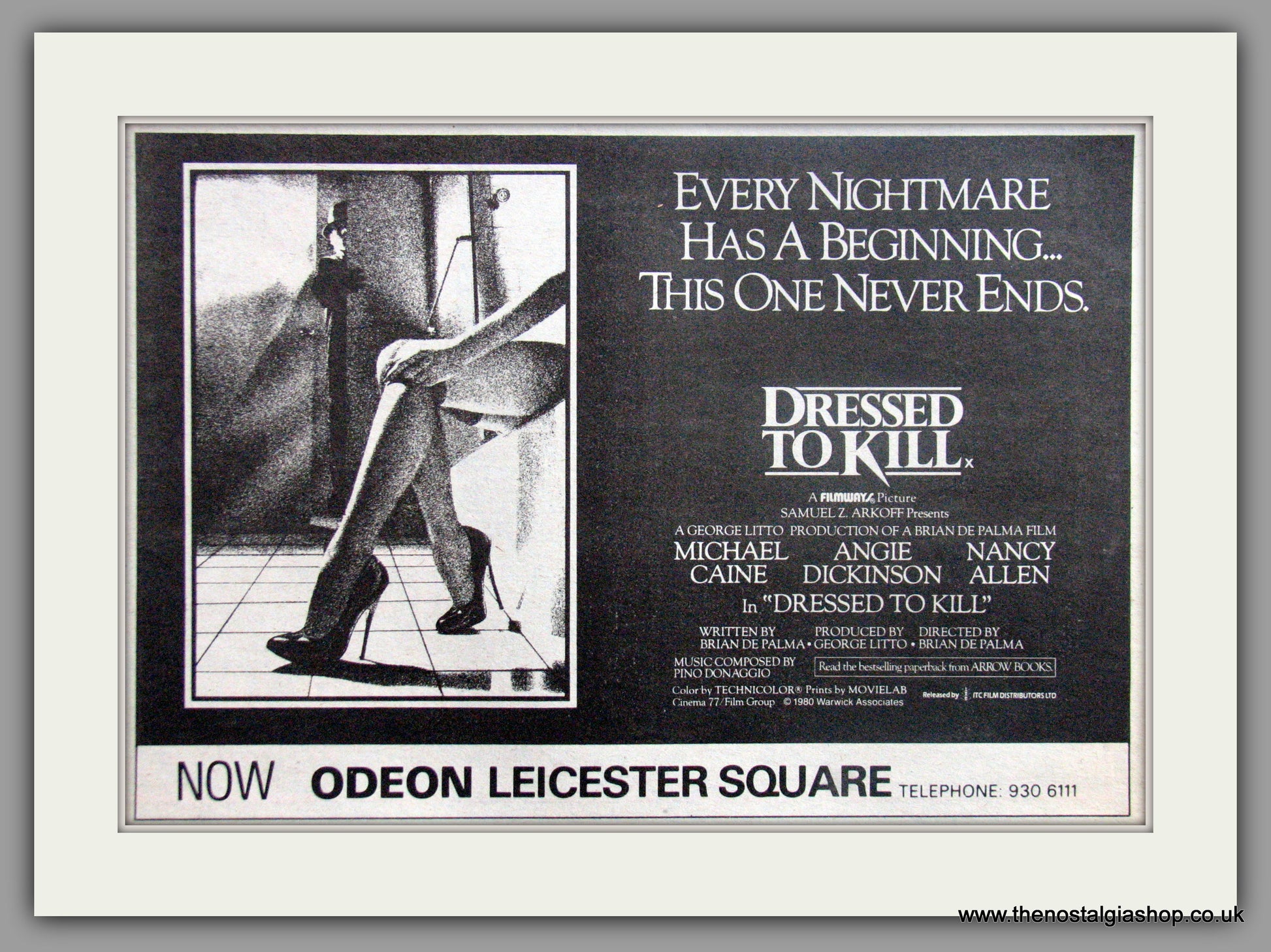 Dressed To Kill-Michael Caine, Angie Dickinson. Original Advert from 1980. Presented in creme bevel cut mount with backing board. Made to fit straight into 14 x 11 inch frame.The perfect gift.- These adverts are all taken from Original publications of the dates stated. They are NOT modern reprints. Many are difficult to get hold of , some are very rare and once sold may not be replaced, Remember, you are buying a piece of historic nostalgia.Lots more adverts available. Please contact us if you don't see the advert you want.