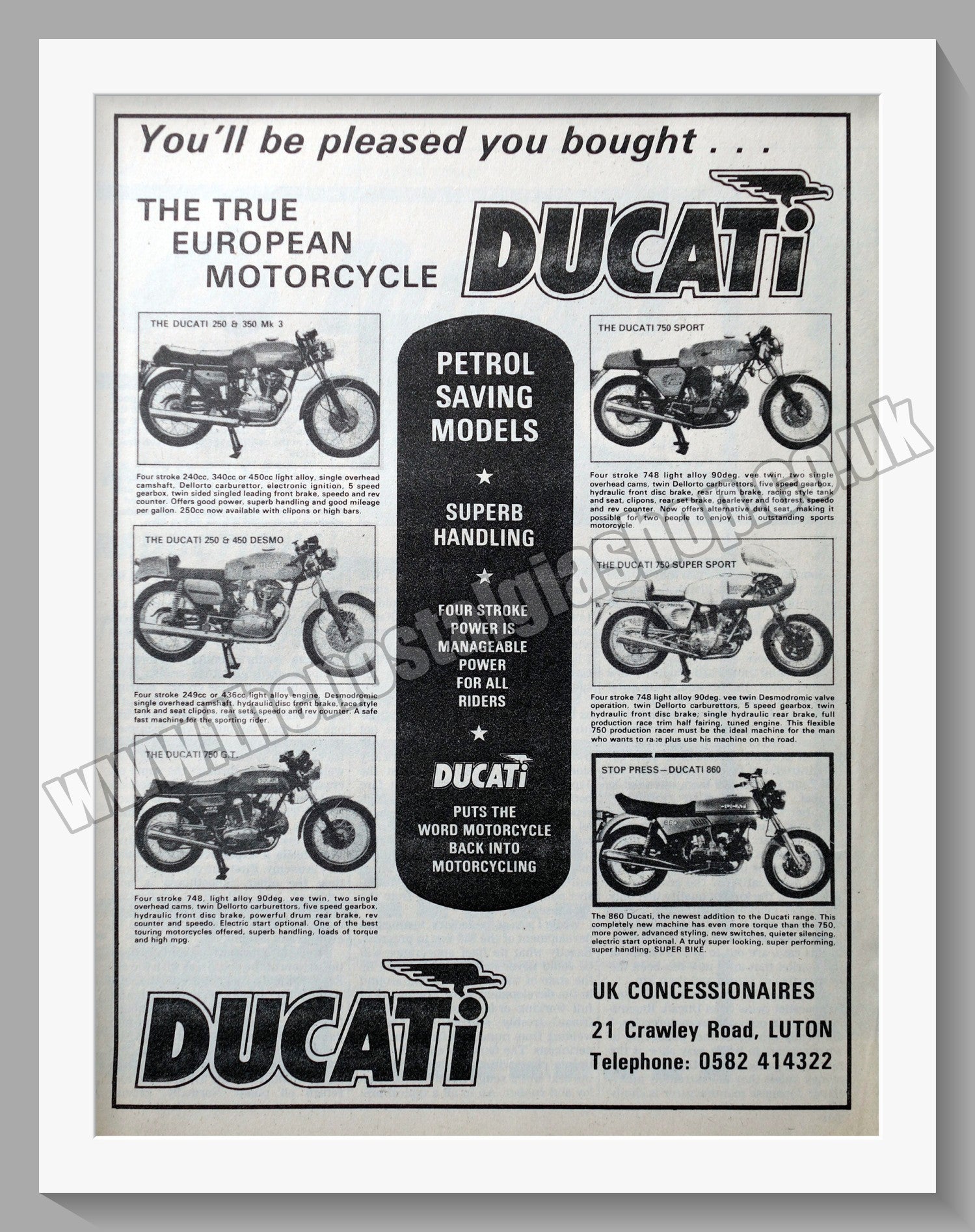 Ducati Motor Cycle Range. Original Vintage Advert from 1975. Presented and Supplied in a 14 x 11 Inch, cream bevel cut mount with backing board and Clear bag. Ready to frame. The perfect gift. These adverts are all Originals from the year stated. They are NOT modern reprints. Many are difficult to get hold of , some are very rare and once sold may not be replaced, Remember, you are buying a piece of historic nostalgia. Website Watermark is not on the product.