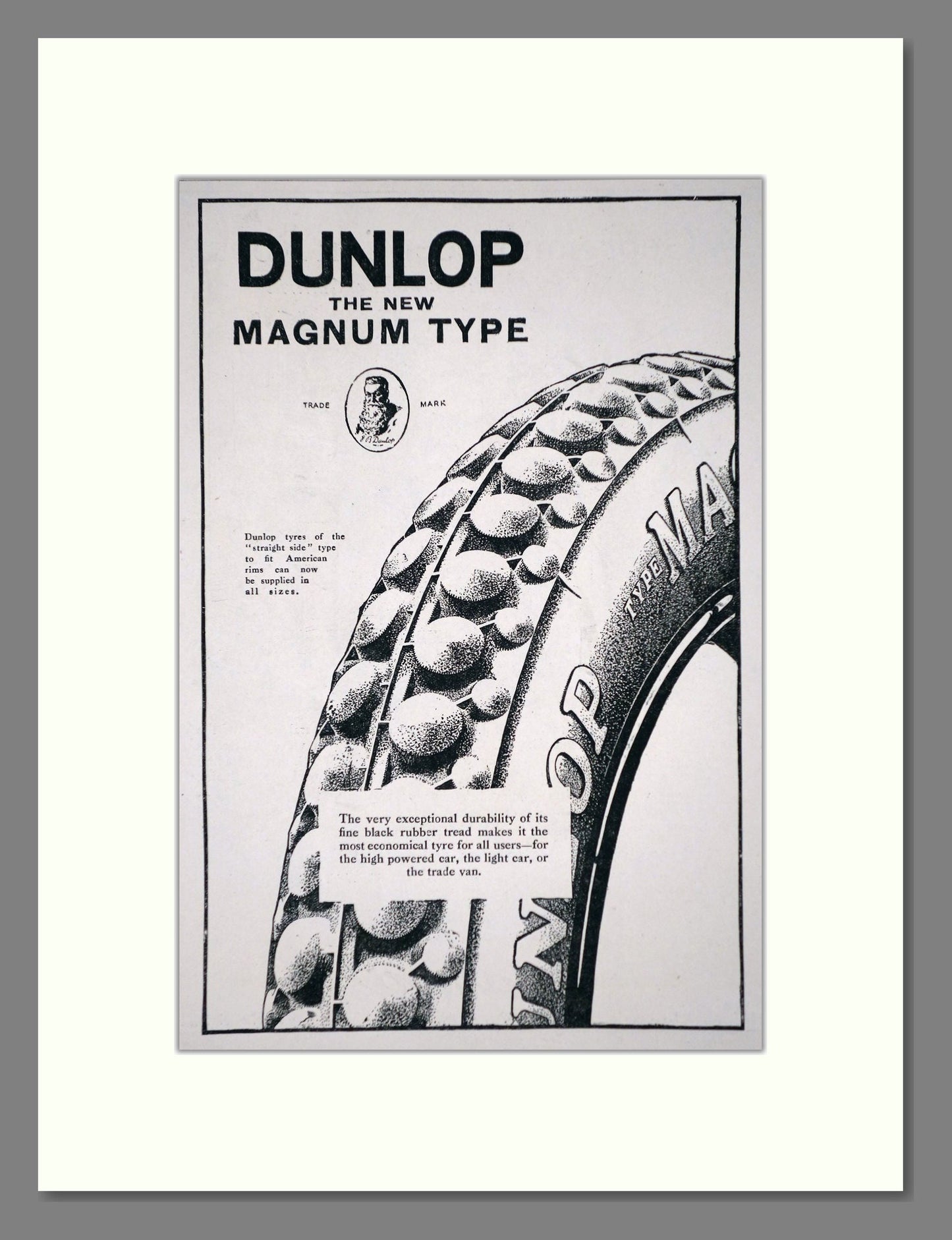 Dunlop - Magnum. Vintage Advert. This is a classic original advert from 1920. Presented and supplied in a cream bevel cut mount with backing card and clear bag. Ready to fit in a 14 x 11 inches frame. The mounted advert will be posted via courier and well packed - protected with a sheet of hardboard to keep it rigid. Any questions or enquiries, please get in touch, we are here to help! All our adverts, unless clearly stated are originals from the date shown. They make excellent pieces of wall art and stunning gifts. Many are rare and hard to find and once sold, may not be replaced. Remember you are buying a piece of history. Website watermark is not on original. Vintage Tyres, Vintage Wheels