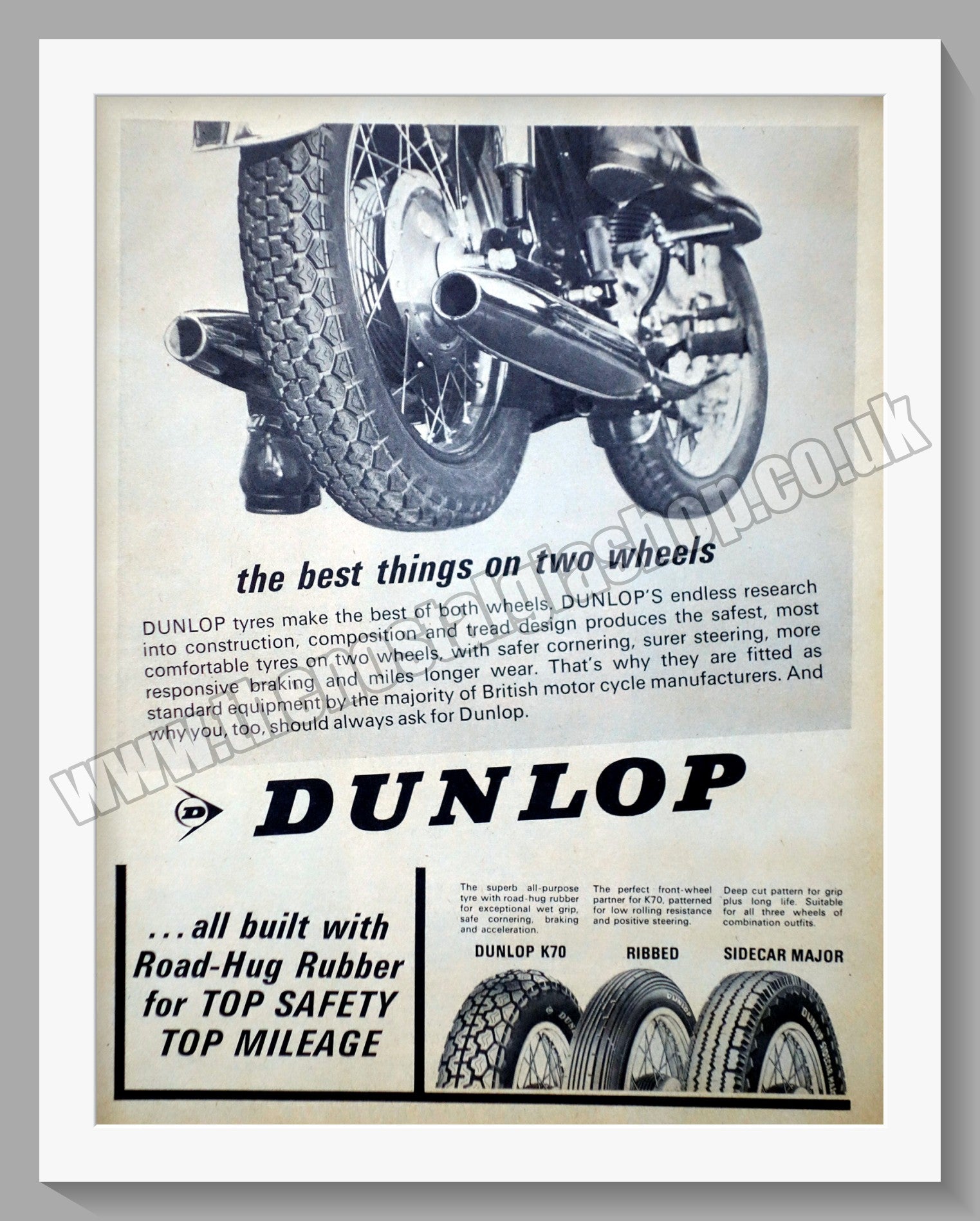 Dunlop Motor Cycle Tyres. Original Vintage Advert 1965. Presented and Supplied in a 14 x 11 Inch, cream bevel cut mount with backing card and clear bag. Ready to frame. All our adverts, unless clearly stated are Originals from the date shown They make excellent pieces of wall art and stunning gifts. Many are rare and hard to find and once sold, may not be replaced. Remember you are buying a piece of history. Website watermark is not on original. Vintage Motorcycle Tyres, Old Motorcycle Tyres.