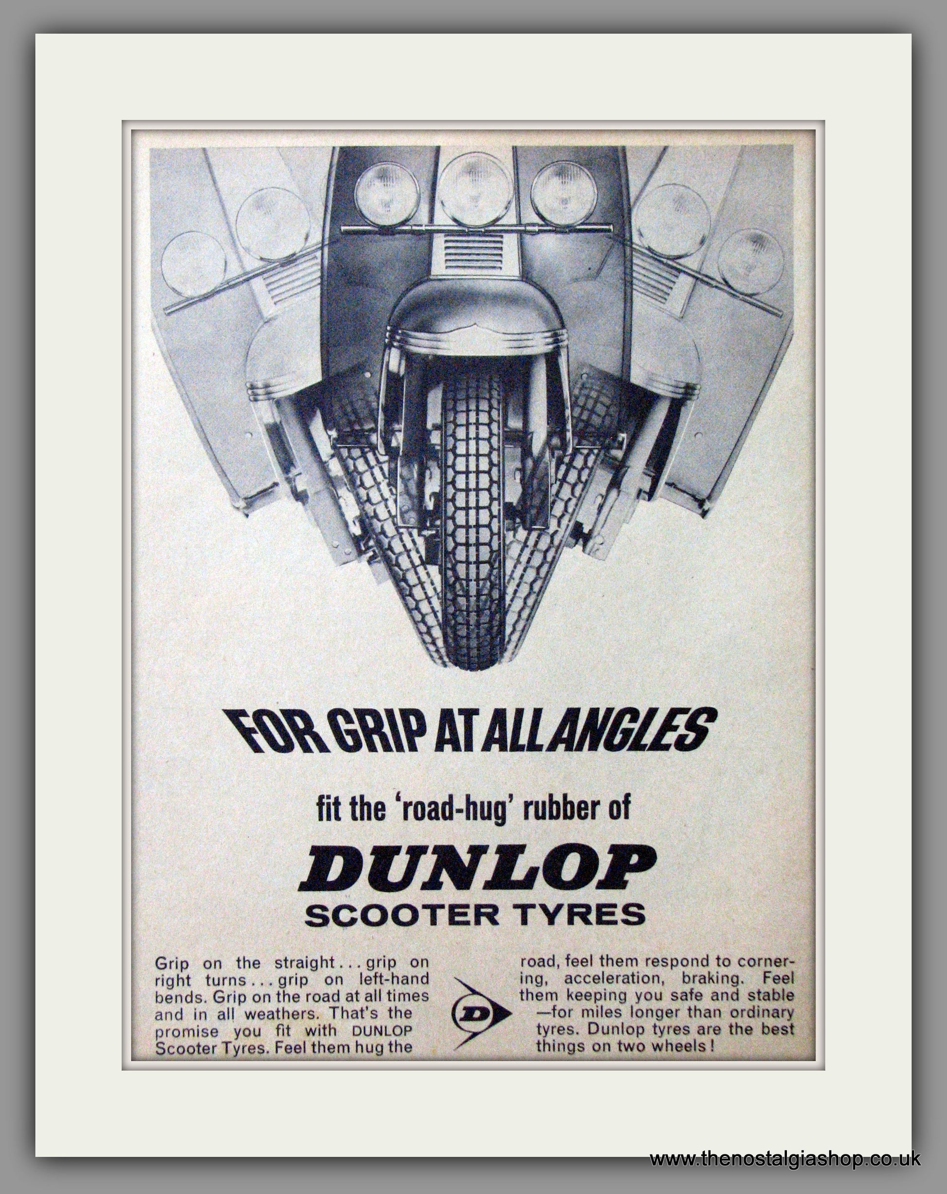 Dunlop Scooter Tyres. Vintage Original Advert from 1966. Presented and Supplied in cream bevel cut mount with backing board and clear bag. Made to fit straight into 14 by 11 inch frame. All our Adverts, unless clearly stated are Original and from the year stated. They are NOT modern reprints. Many are difficult to get hold of , some are very rare and once sold may not be replaced, Remember, you are buying a piece of historic nostalgia. Lots more adverts available. Please contact us if you don't see the advert you want. Scooters. Mods.