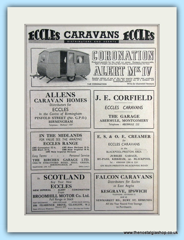 Eccles Caravans. In Scotland buy your new Eccles. Classic original advert 1953. Presented in cream bevel cut mount with backing card and clear bag. Ready to fit in 14 x 11 inch frame. Want it framing? If so, buy this then go to Frames Available Category. Click to buy on the suitable frame and we will do the rest. All our adverts, unless clearly stated are Originals from the date shown They make excellent pieces of wall art and stunning gifts. Many are rare and hard to find and once sold, may not be replaced. Remember you are buying a piece of history. Website watermark is not on original.