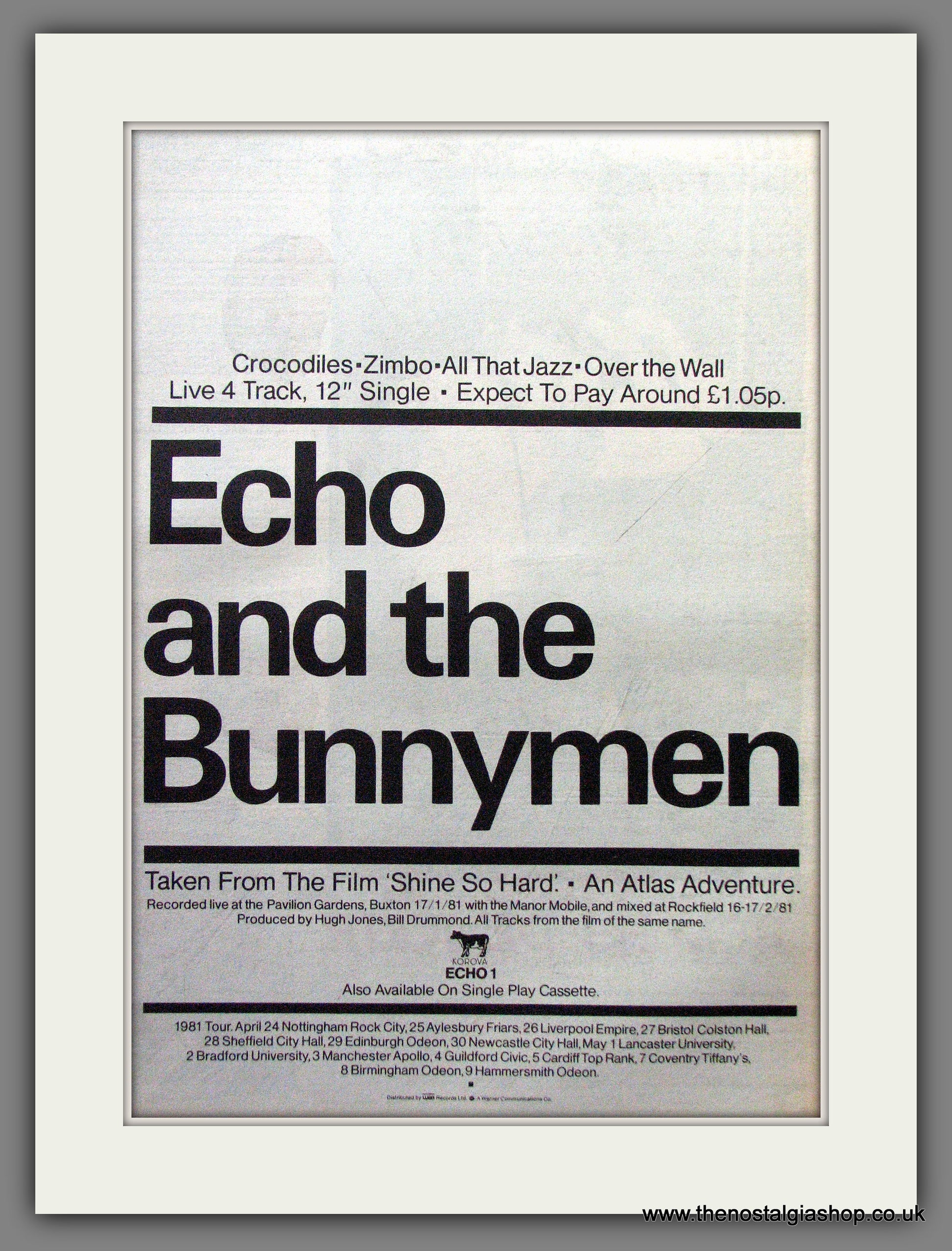 Echo And The Bunnymen From The Film Shine So Hard. Original Advert 1981 (ref AD12860). Presented and supplied in a cream bevel cut mount with backing card and clear bag. Ready to fit in a 20x16 inch frame. The mounted advert will be posted via courier and well packed - protected with a sheet of hardboard to keep it rigid. Any questions or enquiries, please get in touch, we are here to help! All our adverts, unless clearly stated are originals from the date shown. They make excellent pieces of wall art and stunning gifts. Many are rare and hard to find and once sold, may not be replaced. Remember you are buying a piece of history. Website watermark is not on original.