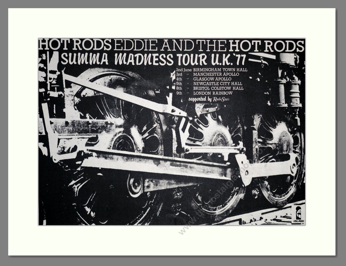 Eddie And The Hotrods - UK Tour. Vintage Advert. This is a large classic original advert from 1977. Presented and supplied in a cream bevel cut mount with backing card and clear bag. Ready to fit in a 20 x 16 inches frame. The mounted advert will be posted via courier and well packed - protected with a sheet of hardboard to keep it rigid. Any questions or enquiries, please get in touch, we are here to help! All our adverts, unless clearly stated are originals from the date shown. They make excellent pieces of wall art and stunning gifts. Many are rare and hard to find and once sold, may not be replaced. Remember you are buying a piece of history. Website watermark is not on original.