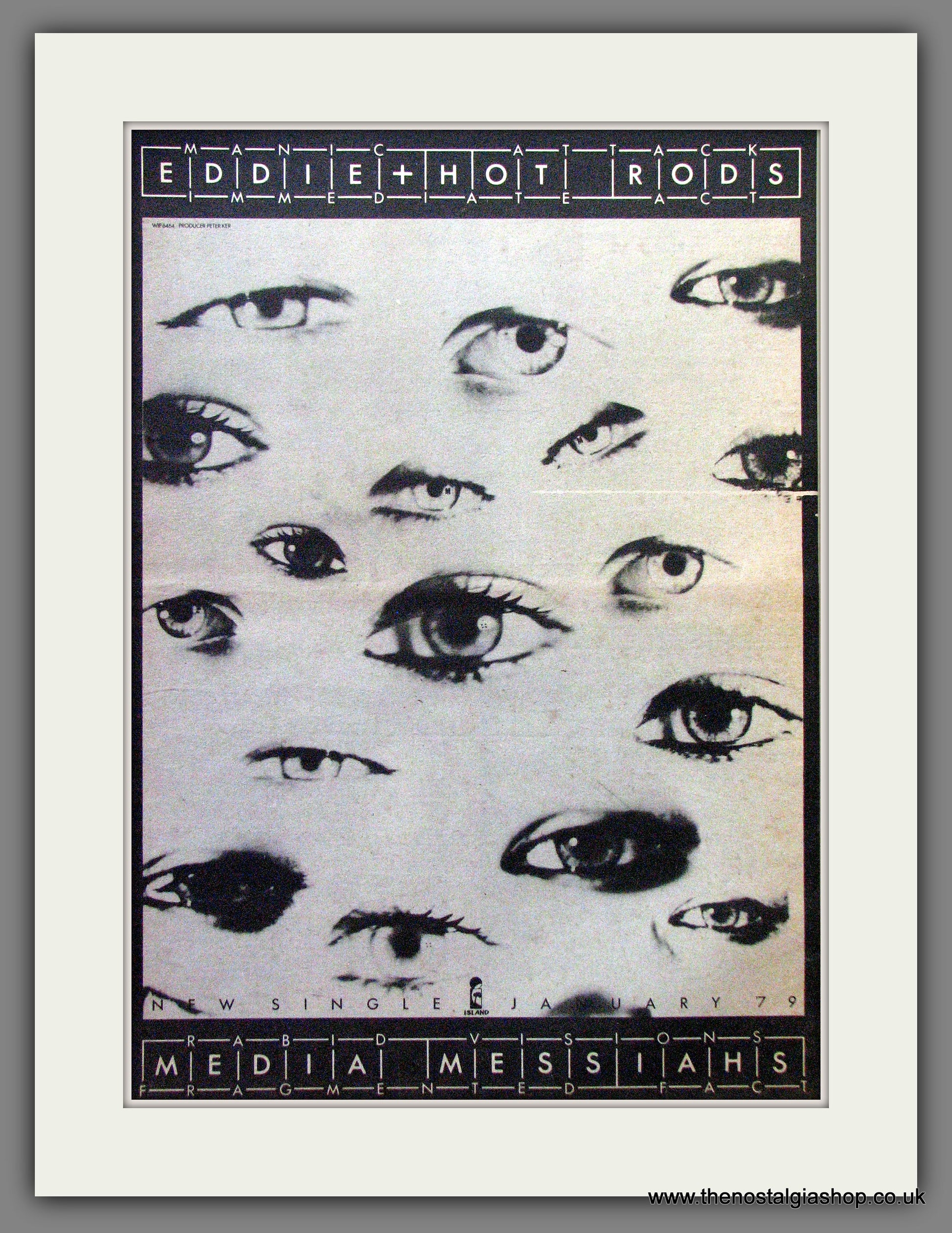 Eddie & Hot Rods Media Messiahs. Original Advert 1979 (ref AD12851). Presented and supplied in a cream bevel cut mount with backing card and clear bag. Ready to fit in a 20x16 inch frame. The mounted advert will be posted via courier and well packed - protected with a sheet of hardboard to keep it rigid. Any questions or enquiries, please get in touch, we are here to help! All our adverts, unless clearly stated are originals from the date shown. They make excellent pieces of wall art and stunning gifts. Many are rare and hard to find and once sold, may not be replaced. Remember you are buying a piece of history. Website watermark is not on original.