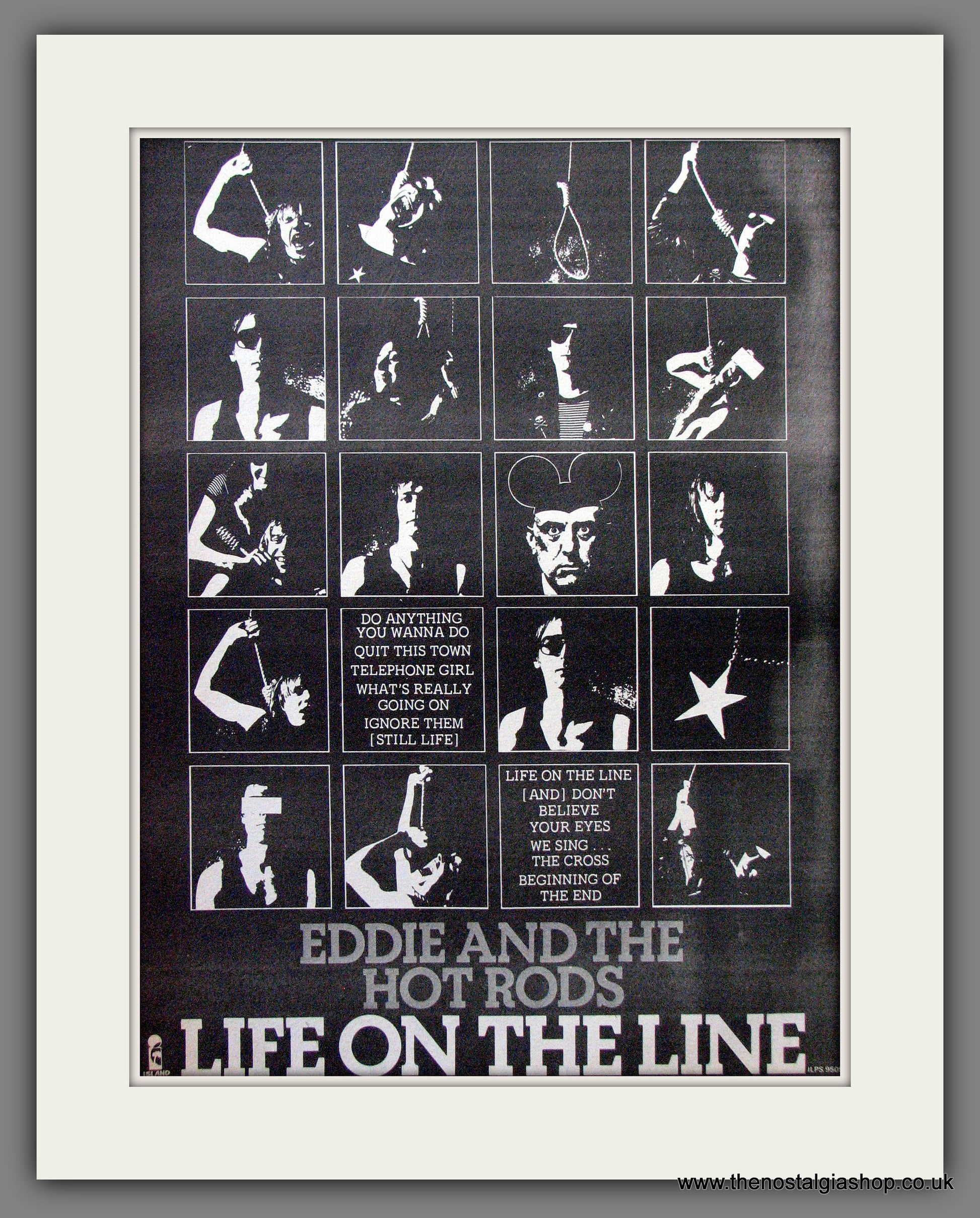 Eddie & The Hot Rods Life On The Line. Original Advert 1977 (ref AD12854). Presented and supplied in a cream bevel cut mount with backing card and clear bag. Ready to fit in a 20x16 inch frame. The mounted advert will be posted via courier and well packed - protected with a sheet of hardboard to keep it rigid. Any questions or enquiries, please get in touch, we are here to help! All our adverts, unless clearly stated are originals from the date shown. They make excellent pieces of wall art and stunning gifts. Many are rare and hard to find and once sold, may not be replaced. Remember you are buying a piece of history. Website watermark is not on original.
