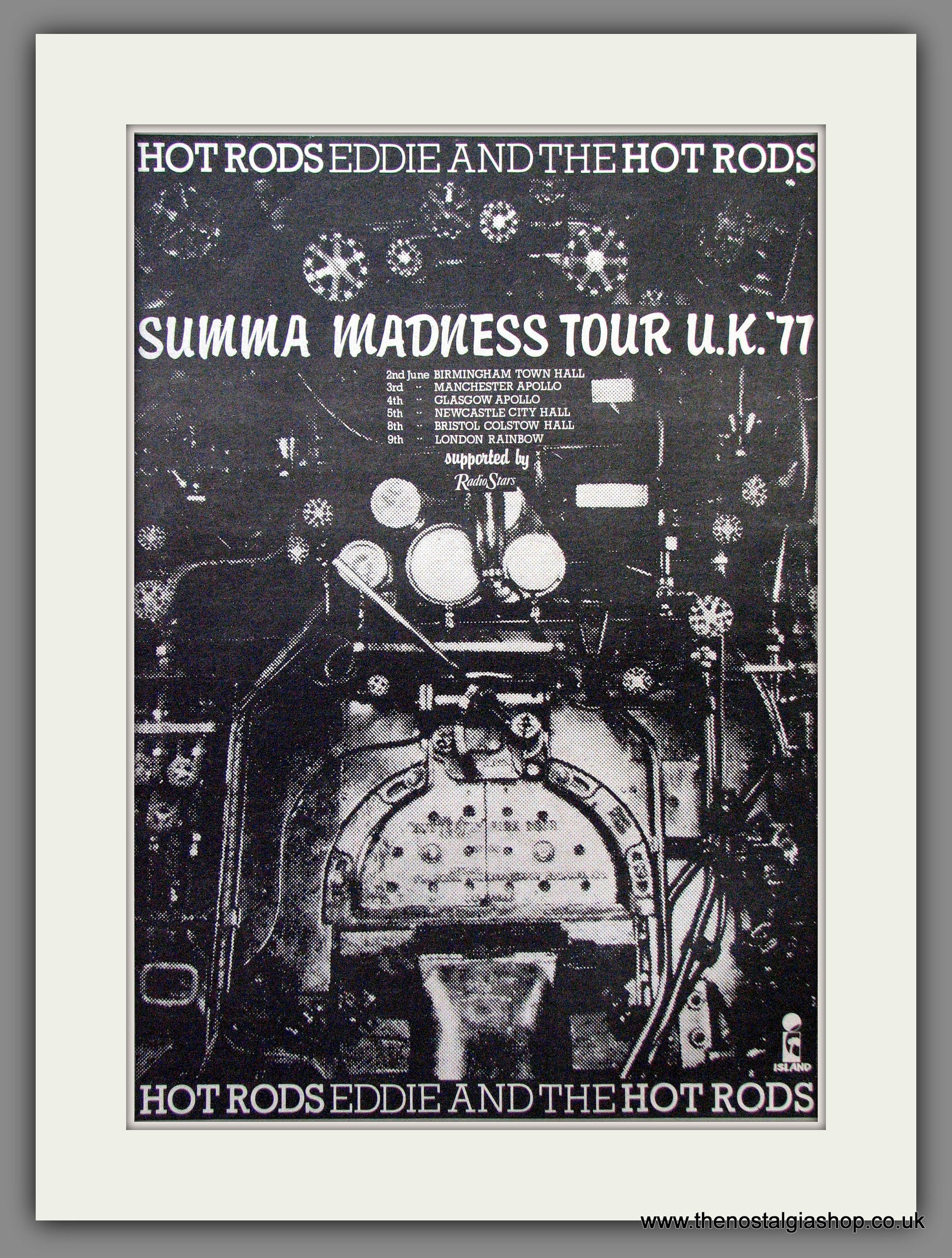 Eddie & The Hot Rods Summa Madness Tour UK. Original Advert 1977 (ref AD12857). Presented and supplied in a cream bevel cut mount with backing card and clear bag. Ready to fit in a 20x16 inch frame. The mounted advert will be posted via courier and well packed - protected with a sheet of hardboard to keep it rigid. Any questions or enquiries, please get in touch, we are here to help! All our adverts, unless clearly stated are originals from the date shown. They make excellent pieces of wall art and stunning gifts. Many are rare and hard to find and once sold, may not be replaced. Remember you are buying a piece of history. Website watermark is not on original.