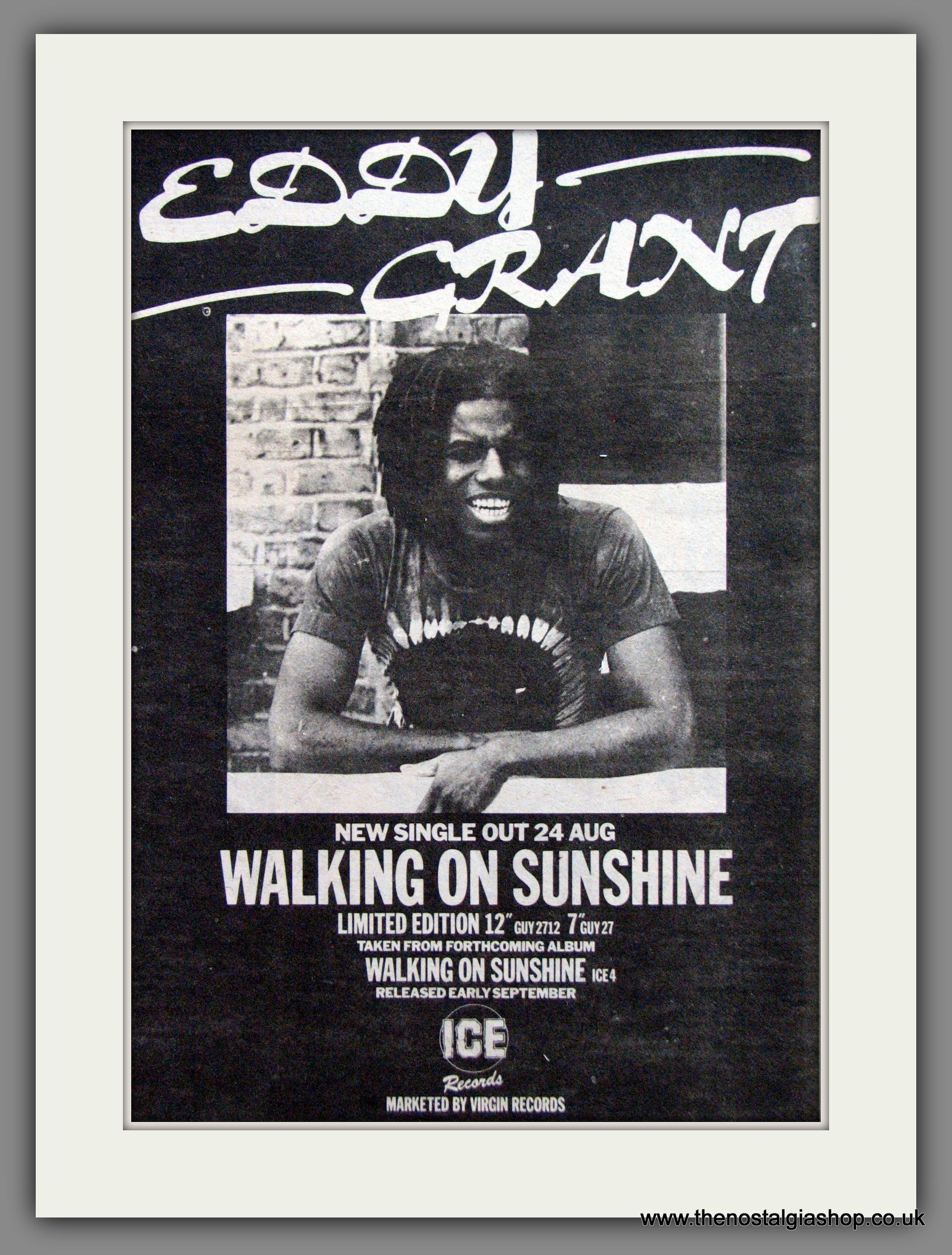 Eddy Grant. Walking On Sunshine. Classic original advert 1979. Presented and Supplied in cream bevel cut mount with backing card and clear bag. Ready to fit in 14 x 11 inch frame. Want it framing? If so, buy this then go to Frames Available Category. Click to buy on the suitable frame and we will do the rest. All our adverts, unless clearly stated are Originals from the date shown. They make excellent pieces of wall art and stunning gifts. Many are rare and hard to find and once sold, may not be replaced. Remember you are buying a piece of history. Website watermark is not on original.
