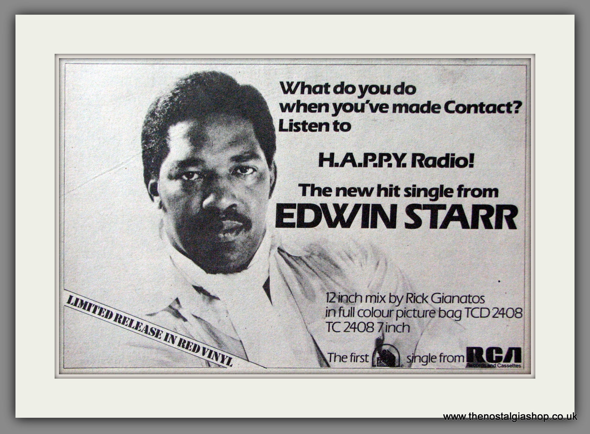 Edwin Starr.Happy Radio. Classic original advert 1982. Presented and Supplied in a cream bevel cut mount with backing card and clear bag. Ready to fit in 14 x 11 inch frame. Want it framing? If so, buy this then go to Frames Available Category. Click to buy on the suitable frame and we will do the rest. All our adverts, unless clearly stated are Originals from the date shown. They make excellent pieces of wall art and stunning gifts. Many are rare and hard to find and once sold, may not be replaced. Remember you are buying a piece of history. Website watermark is not on original.