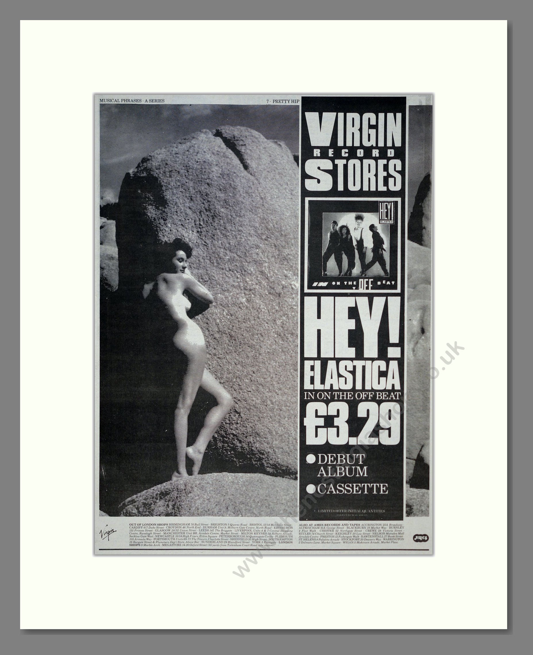Elastica - Hey!. Vintage Advert. This is a large classic original advert from 1984. Presented and supplied in a cream bevel cut mount with backing card and clear bag. Ready to fit in a 20 x 16 inches frame. The mounted advert will be posted via courier and well packed - protected with a sheet of hardboard to keep it rigid. Any questions or enquiries, please get in touch, we are here to help! All our adverts, unless clearly stated are originals from the date shown. They make excellent pieces of wall art and stunning gifts. Many are rare and hard to find and once sold, may not be replaced. Remember you are buying a piece of history. Website watermark is not on original.
