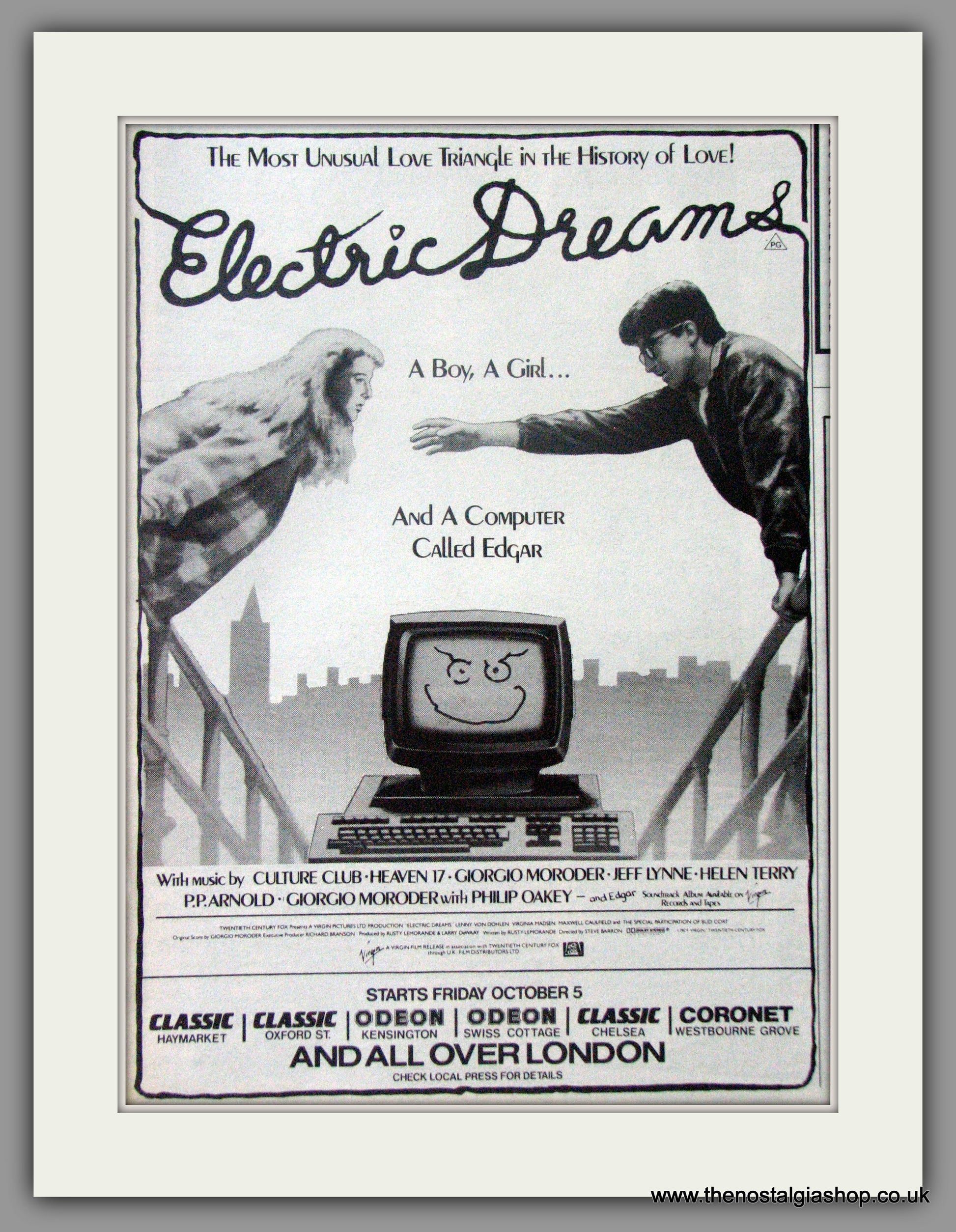 Electric Dreams. A boy, a girl... And a computer called Edgar. Original Advert 1984. Presented in cream bevel cut mount with backing board. Made to fit straight into 14 x 11 inch frame. The perfect gift.- These adverts are all taken from Original publications of the dates stated. They are NOT modern reprints. Many are difficult to get hold of , some are very rare and once sold may not be replaced, Remember, you are buying a piece of historic nostalgia. Lots more adverts available. Please contact us if you don't see the advert you want.