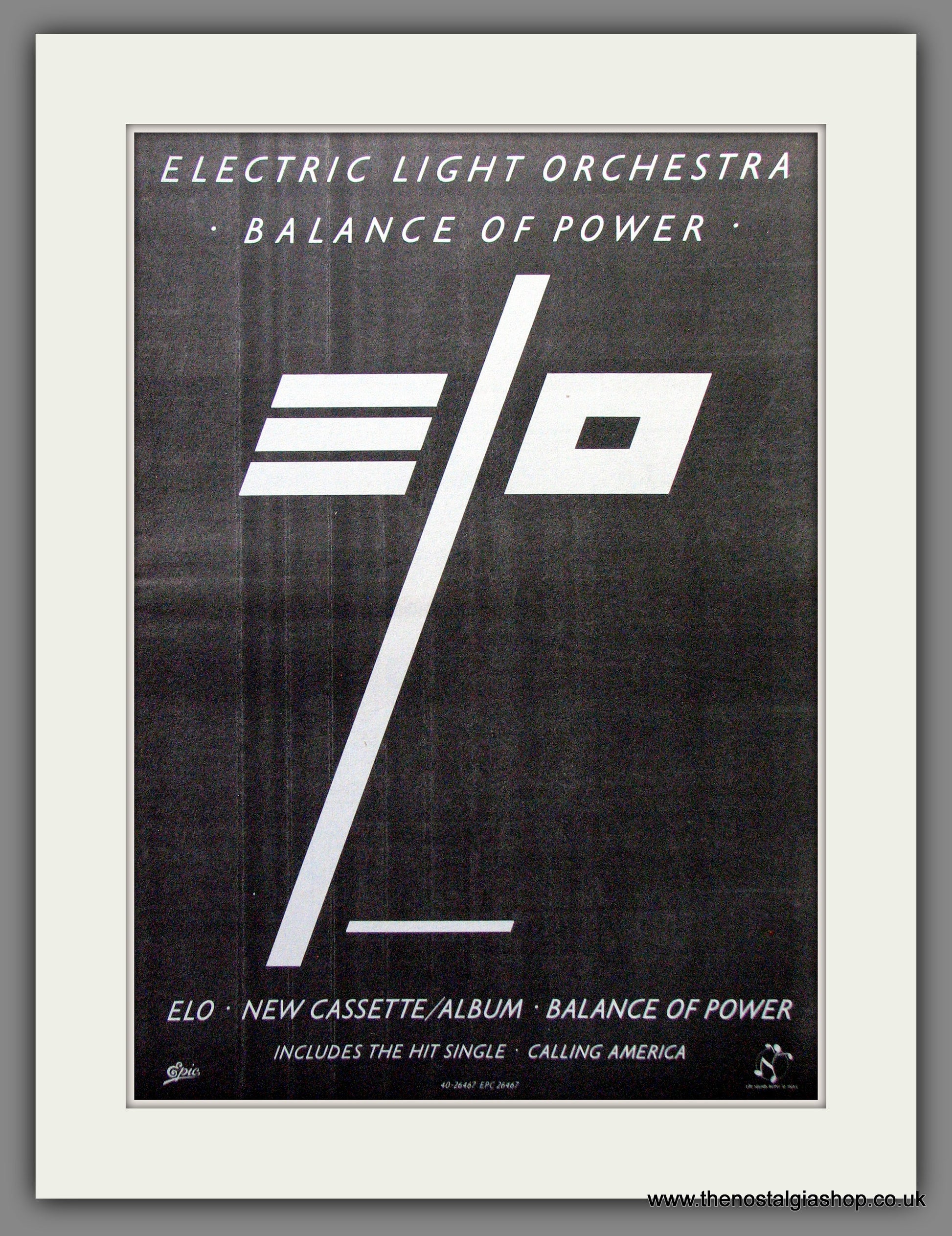 Electric Light Orchestra Balance Of Power. ELO. This is a large Original Vintage Advert 1986. Presented and Supplied in a cream, bevel cut mount with backing card and clear bag. Ready to fit in 20 x 16 inch frame. The mounted advert will be posted via courier and well packed - protected with a sheet of hardboard to keep it rigid. Any questions or inquiries, please get in touch, we are here to help! All our adverts, unless clearly stated are Originals from the date shown. They make excellent pieces of wall art and stunning gifts. Many are rare and hard to find and once sold, may not be replaced. Remember you are buying a piece of history. Website watermark is not on original.
