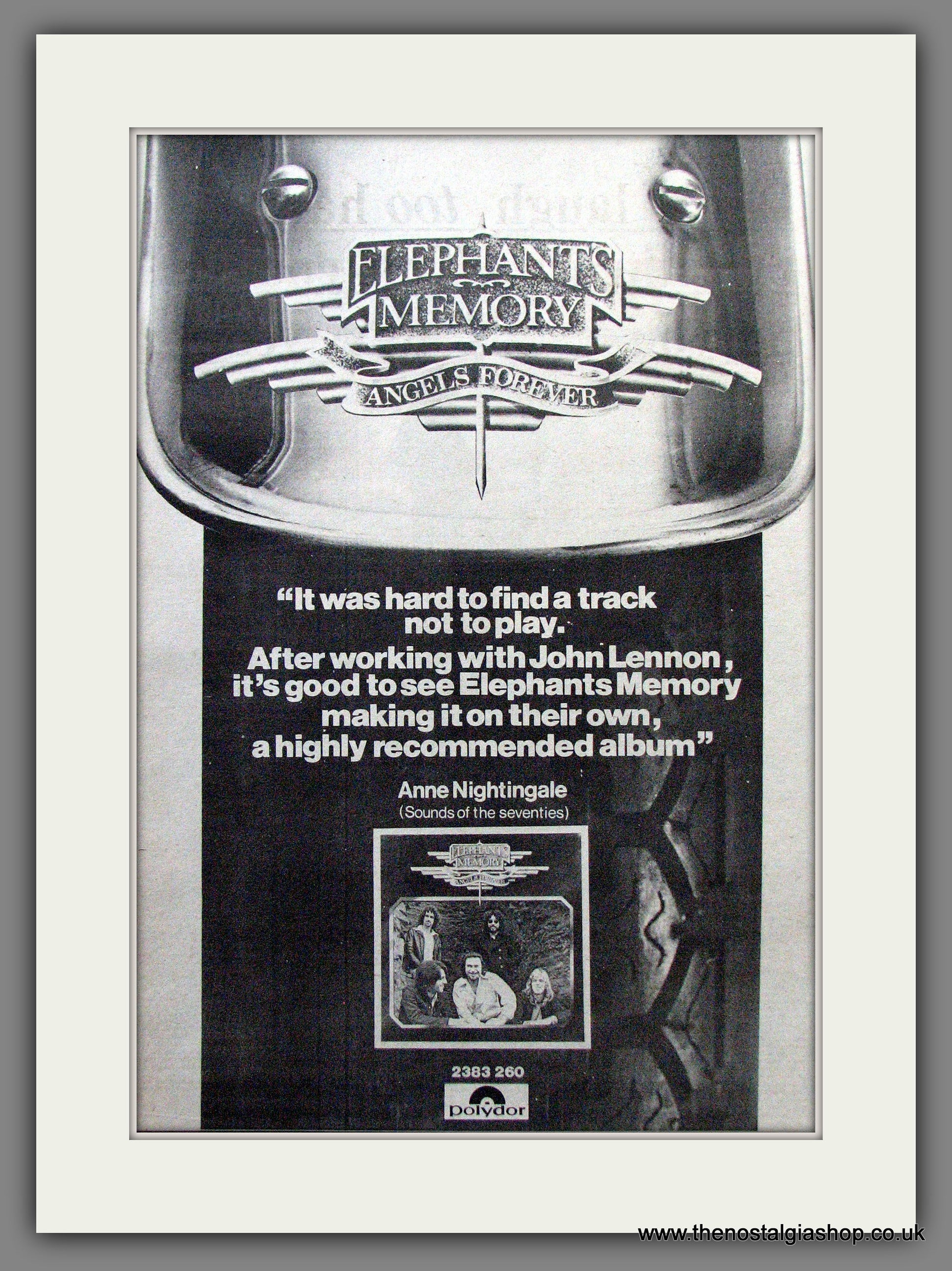 Elephants Memory Angels Forever. Original Advert 1974 (ref AD12775). Presented and supplied in a cream bevel cut mount with backing card and clear bag. Ready to fit in a 20x16 inch frame. The mounted advert will be posted via courier and well packed - protected with a sheet of hardboard to keep it rigid. Any questions or enquiries, please get in touch, we are here to help! All our adverts, unless clearly stated are originals from the date shown. They make excellent pieces of wall art and stunning gifts. Many are rare and hard to find and once sold, may not be replaced. Remember you are buying a piece of history. Website watermark is not on original.