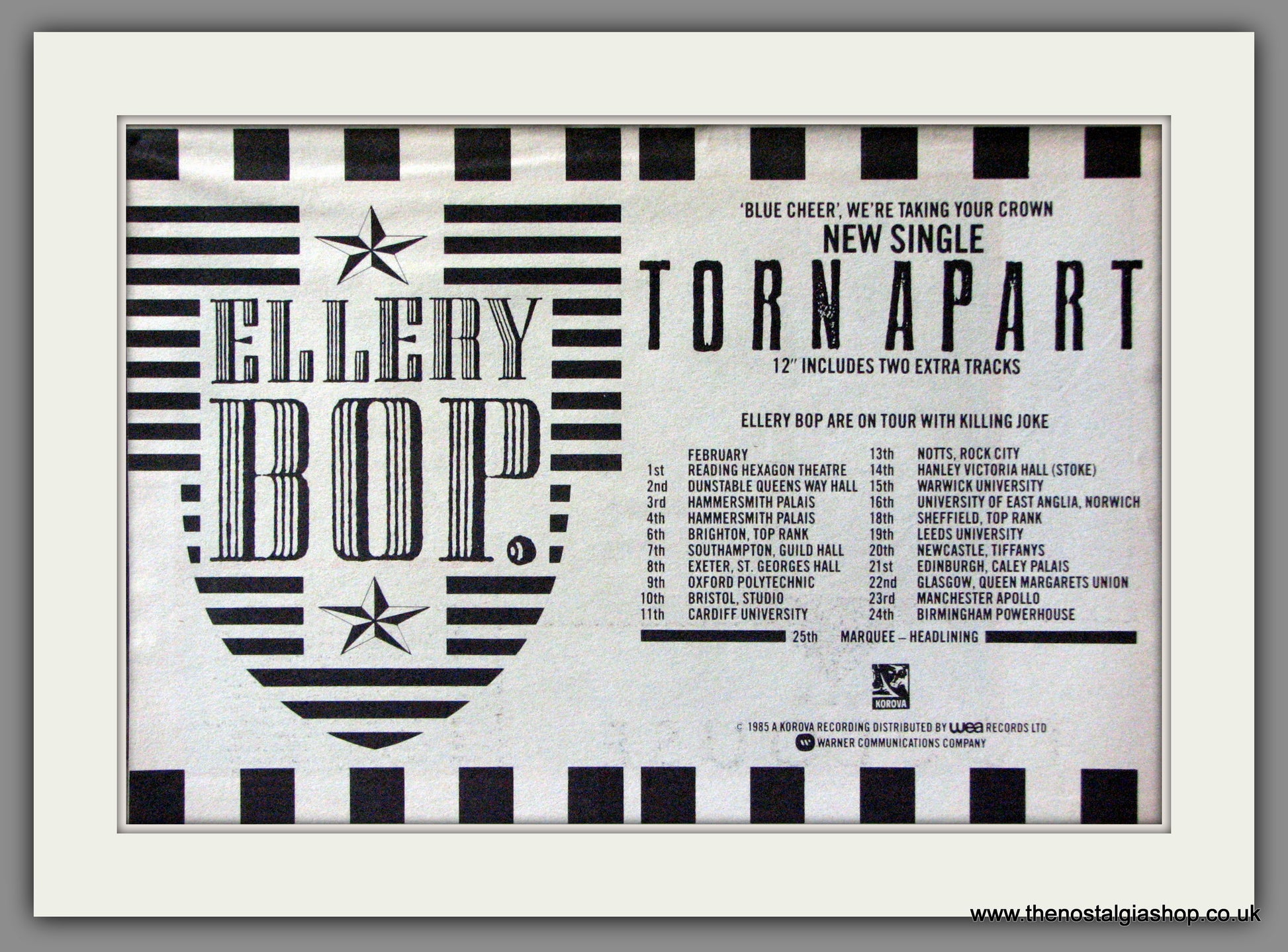 Ellery Bop. UK Tour Dates with Killing Joke. Classic original advert 1985. Presented and Supplied in cream bevel cut mount with backing card and clear bag. Ready to fit in 14 x 11 inch frame. Want it framing? If so, buy this then go to Frames Available Category. Click to buy on the suitable frame and we will do the rest. All our adverts, unless clearly stated are Originals from the date shown. They make excellent pieces of wall art and stunning gifts. Many are rare and hard to find and once sold, may not be replaced. Remember you are buying a piece of history. Website watermark is not on original.