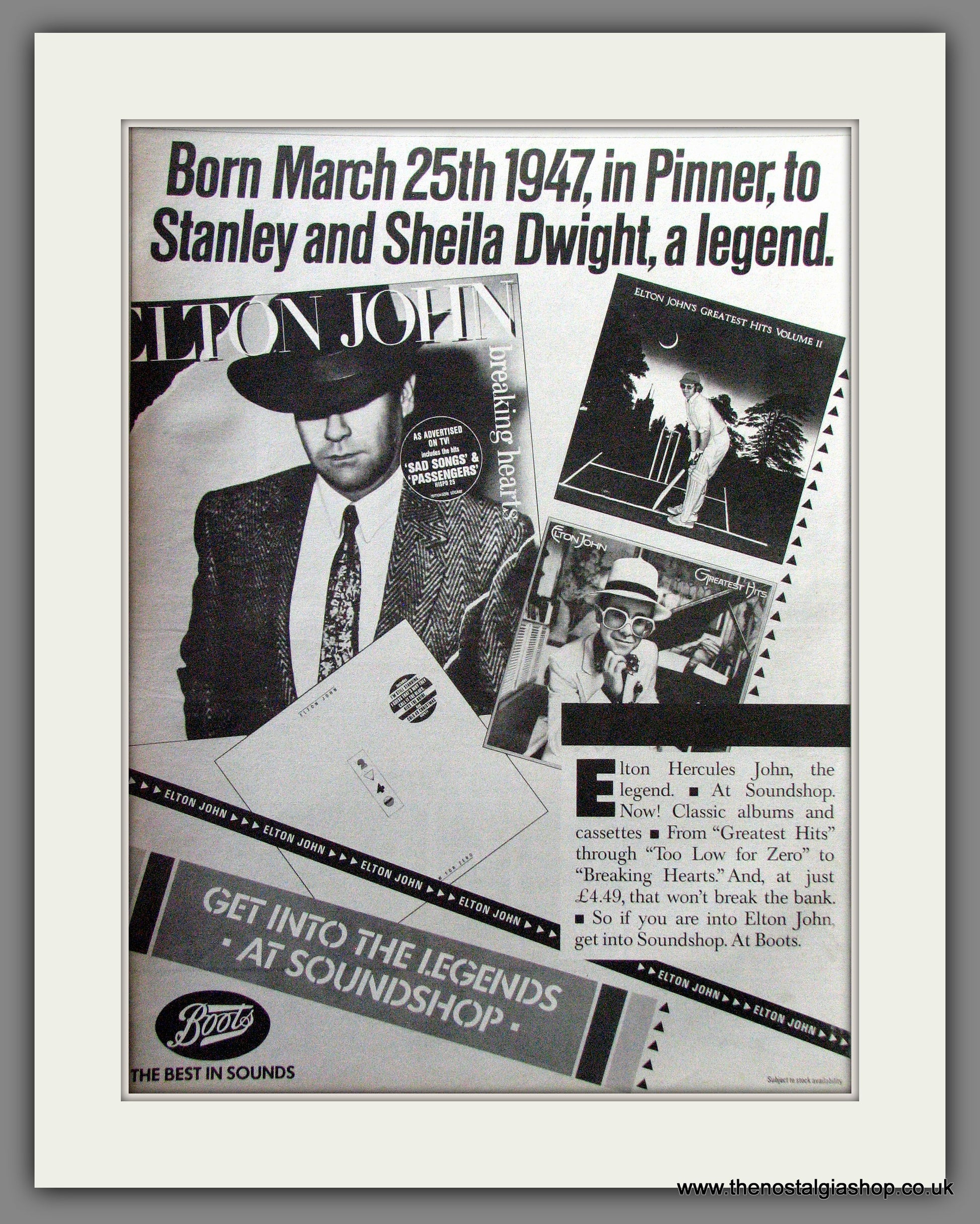 Elton John Albums At Soundshop. Original Advert 1984 (ref AD12848). Presented and supplied in a cream bevel cut mount with backing card and clear bag. Ready to fit in a 20x16 inch frame. The mounted advert will be posted via courier and well packed - protected with a sheet of hardboard to keep it rigid. Any questions or enquiries, please get in touch, we are here to help! All our adverts, unless clearly stated are originals from the date shown. They make excellent pieces of wall art and stunning gifts. Many are rare and hard to find and once sold, may not be replaced. Remember you are buying a piece of history. Website watermark is not on original.