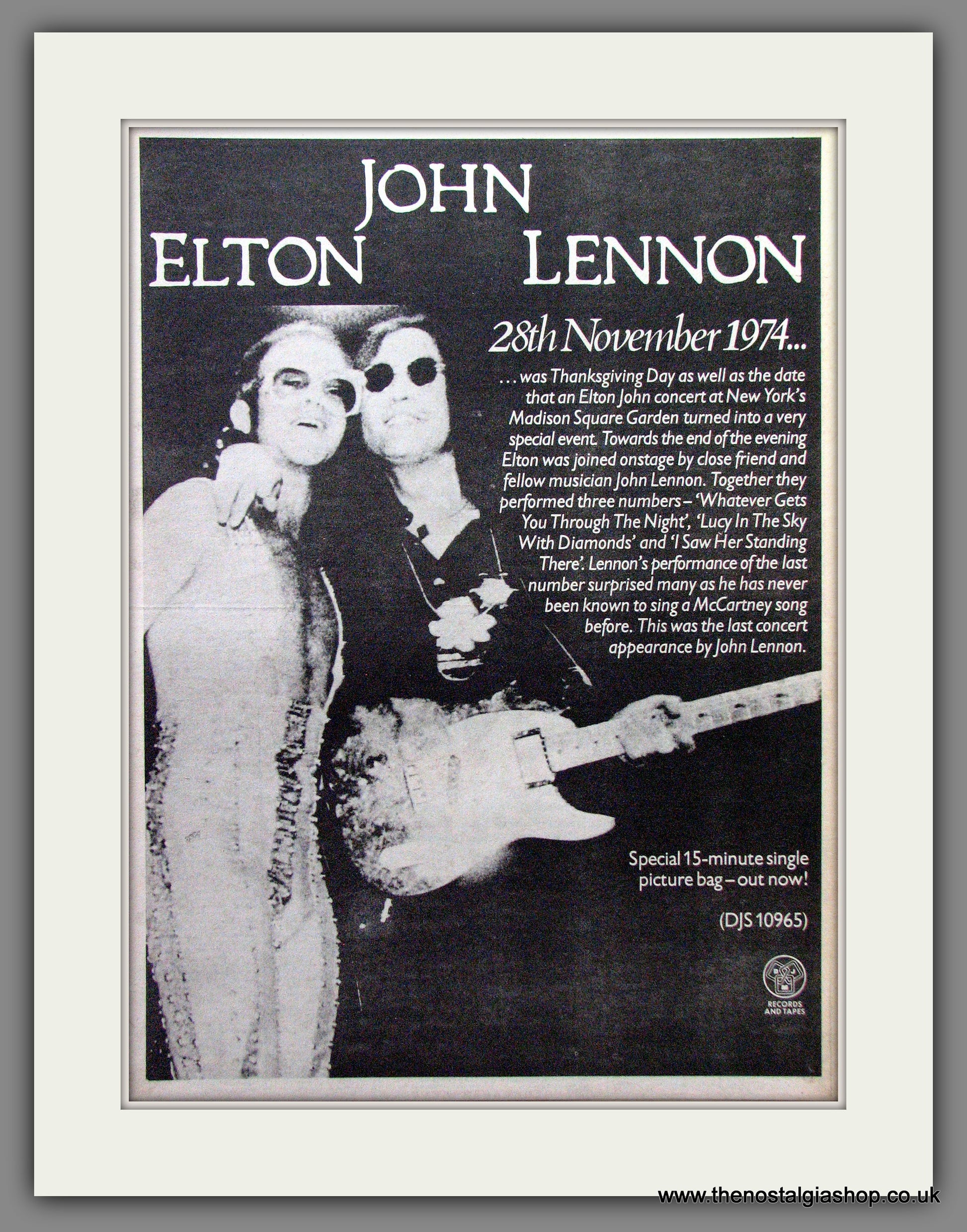 Elton John & John Lennon Concert. Original Advert 1981 (ref AD12836). Presented and supplied in a cream bevel cut mount with backing card and clear bag. Ready to fit in a 20x16 inch frame. The mounted advert will be posted via courier and well packed - protected with a sheet of hardboard to keep it rigid. Any questions or enquiries, please get in touch, we are here to help! All our adverts, unless clearly stated are originals from the date shown. They make excellent pieces of wall art and stunning gifts. Many are rare and hard to find and once sold, may not be replaced. Remember you are buying a piece of history. Website watermark is not on original.