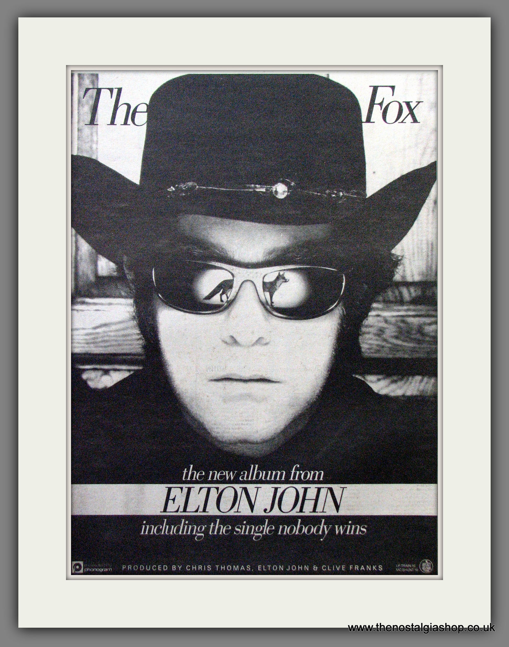 Elton John The Fox. Original Advert 1981 (ref AD12839). Presented and supplied in a cream bevel cut mount with backing card and clear bag. Ready to fit in a 20x16 inch frame. The mounted advert will be posted via courier and well packed - protected with a sheet of hardboard to keep it rigid. Any questions or enquiries, please get in touch, we are here to help! All our adverts, unless clearly stated are originals from the date shown. They make excellent pieces of wall art and stunning gifts. Many are rare and hard to find and once sold, may not be replaced. Remember you are buying a piece of history. Website watermark is not on original.