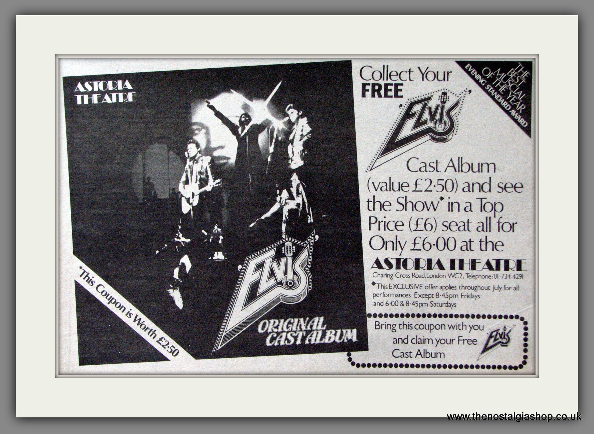 Elvis Presley. Astoria Theatre. Musical. Classic original advert 1978. Presented and Supplied in cream bevel cut mount with backing card and clear bag. Ready to fit in 14 x 11 inch frame. Want it framing? If so, buy this then go to Frames Available Category. Click to buy on the suitable frame and we will do the rest. All our adverts, unless clearly stated are Originals from the date shown. They make excellent pieces of wall art and stunning gifts. Many are rare and hard to find and once sold, may not be replaced. Remember you are buying a piece of history. Website watermark is not on original.