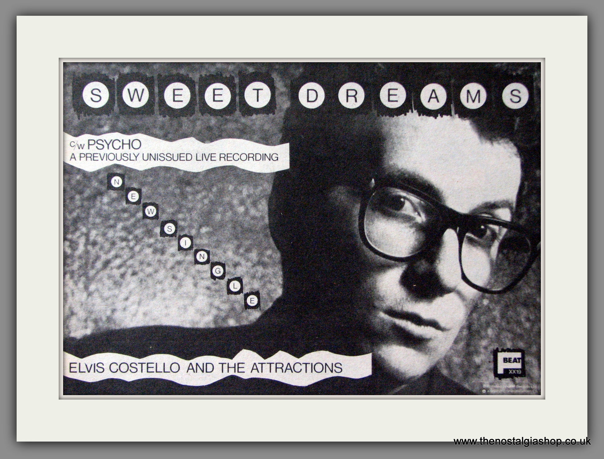Elvis Costello and The Attractions. Sweet Dreams. Classic original advert 1981. Presented and Supplied in cream bevel cut mount with backing card and clear bag. Ready to fit in 14 x 11 inch frame. Want it framing? If so, buy this then go to Frames Available Category. Click to buy on the suitable frame and we will do the rest. All our adverts, unless clearly stated are Originals from the date shown. They make excellent pieces of wall art and stunning gifts. Many are rare and hard to find and once sold, may not be replaced. Remember you are buying a piece of history. Website watermark is not on original.