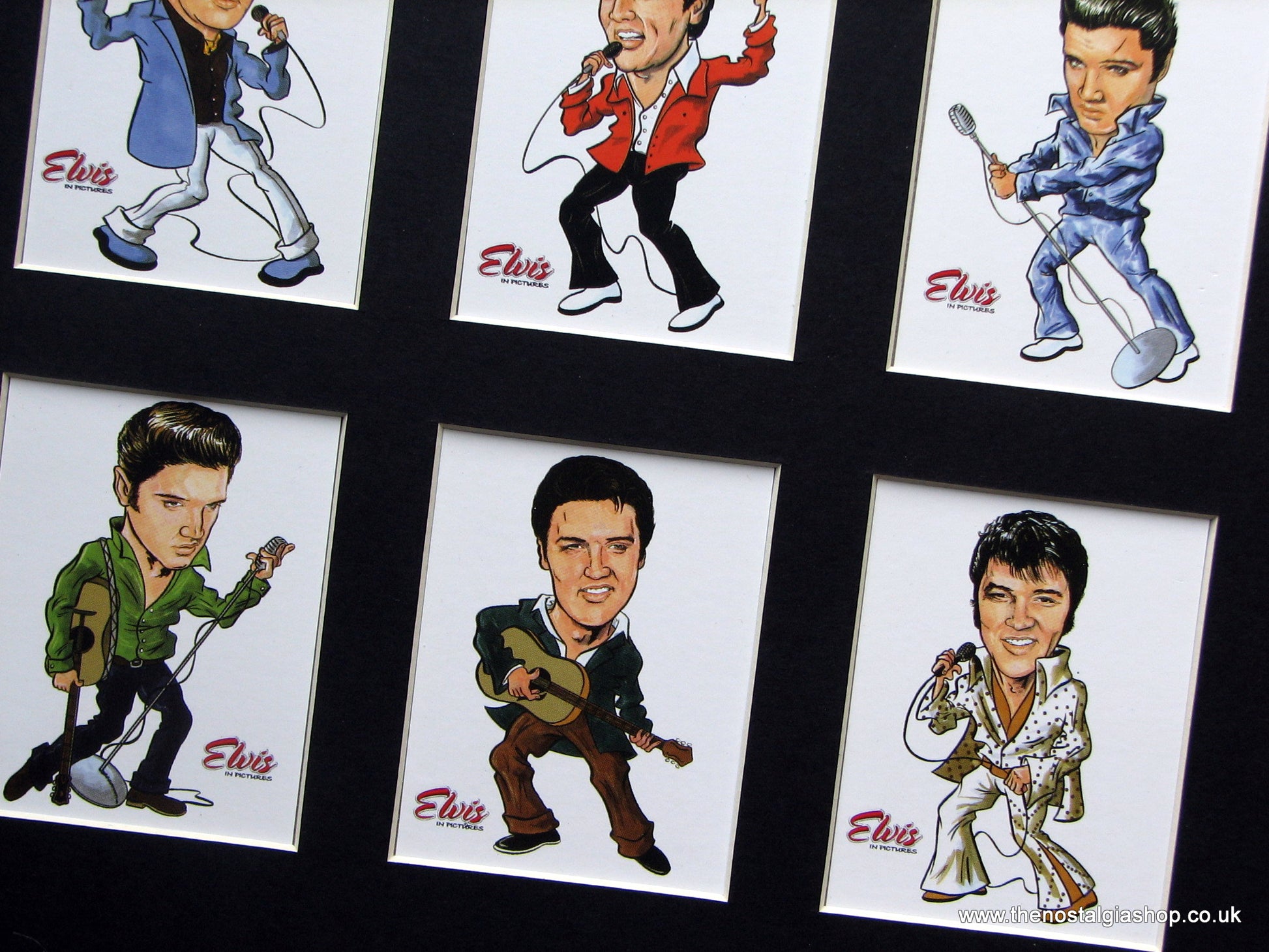 Elvis Presley. Beautiful set of 9 illustrated caricatures showing the King of Rock 'N Roll. Presented and Supplied in a Black, Bevel cut mount with backing card and display bag. Rear of cards not viewable. Made to fit straight into Standard Size 14 x 11 inch frame. Want It Framing? If so, add this to your basket, then go to the Frames Available Category, Click to add the frame of your choice. We will then assemble and post the set to you.