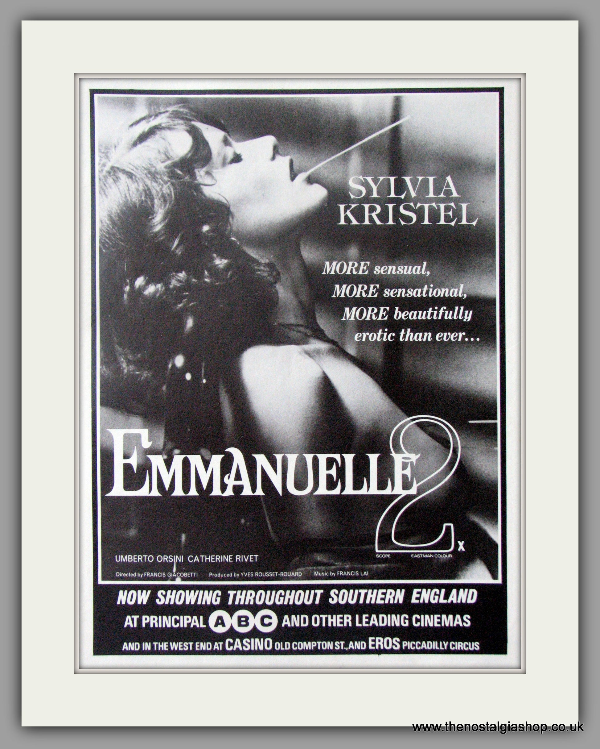 Emmanuelle 2. Original Advert 1976. Presented in creme bevel cut mount with backing board. Made to fit straight into 14 x 11 inch frame.The perfect gift.- These adverts are all taken from Original publications of the dates stated. They are NOT modern reprints. Many are difficult to get hold of , some are very rare and once sold may not be replaced, Remember, you are buying a piece of historic nostalgia.Lots more adverts available. Please contact us if you dont see the advert you want.