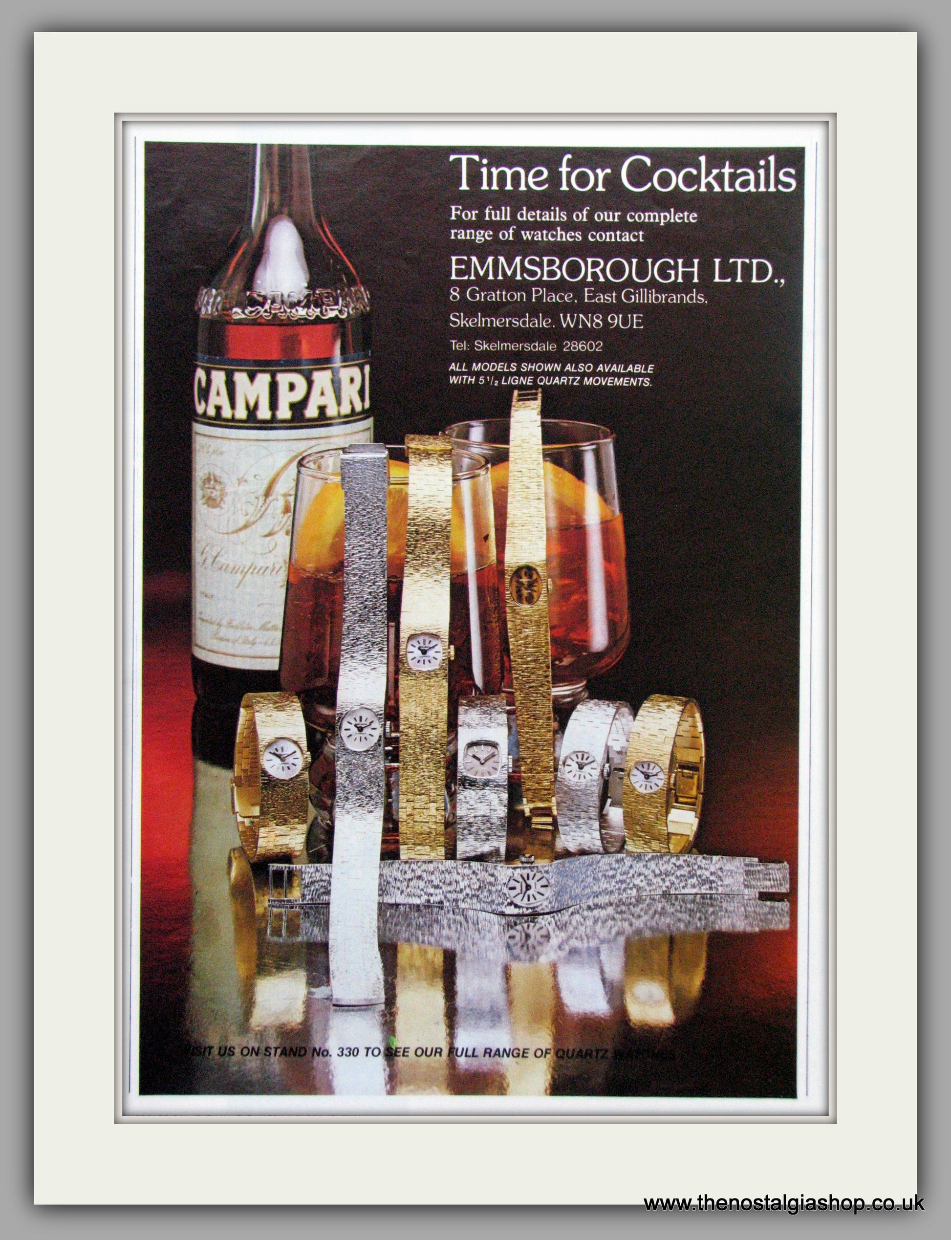 Emmsborough Watches. Time for cocktails. Vintage Advert. Original Advert 1979. Presented in cream bevel cut mount with backing card and clear bag. Ready to fit in 14 x 11 inch frame. Want it framing? If so, buy this then go to Frames Available Category. Click to buy on the suitable frame(s) and we will do the rest. All our adverts, unless clearly stated are Originals from the date shown. They make excellent pieces of wall art and stunning gifts. Many are rare and hard to find and once sold, may not be replaced. Remember you are buying a piece of history. Website watermark is not on original.