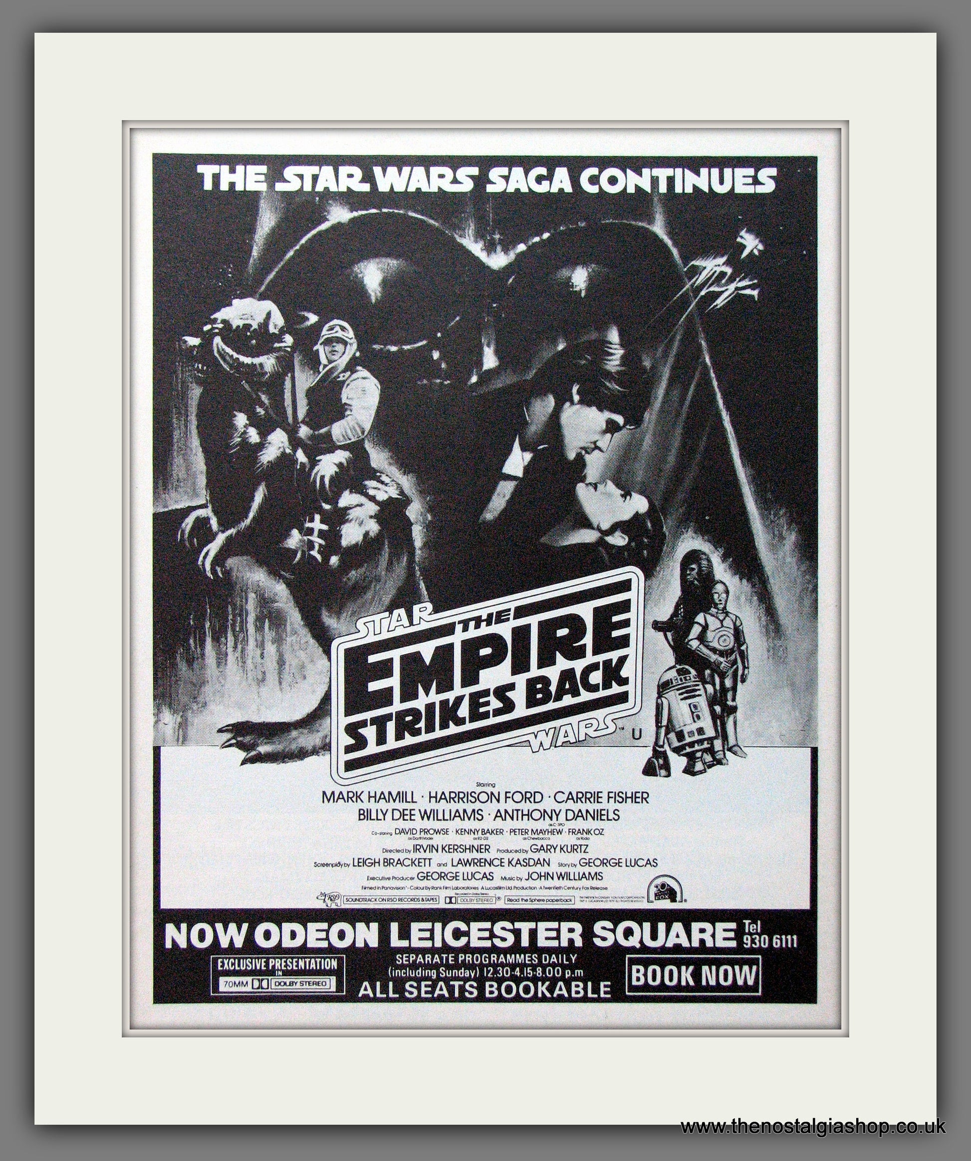 The Empire Strikes Back. Mark Hamill, Harrison Ford, Carrie Fisher. Original advert 1980. Presented and Supplied in a cream bevel cut mount with backing card and Clear Bag. Ready to fit in 14 x 11 inch frame. Want it framing? If so, buy this then go to Frames Available Category. Click to buy on the suitable frame and we will do the rest. All our adverts, unless clearly stated are Originals from the date shown. They make excellent pieces of wall art and stunning gifts. Many are rare and hard to find and once sold, may not be replaced. Remember you are buying a piece of history.