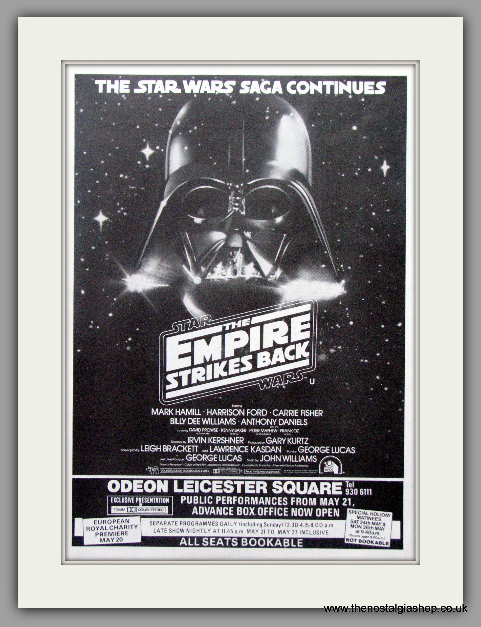 Star Wars, The Empire Strikes Back. Mark Hamill, Harrison Ford, Carrie Fisher. Original advert 1980. Presented in cream bevel cut mount with backing card. Ready to fit in 14 x 11 inch frame. All our adverts, unless clearly stated are Originals from the date shown. They make excellent pieces of wall art and stunning gifts. Many are rare and hard to find and once sold, may not be replaced. Remember you are buying a piece of history.