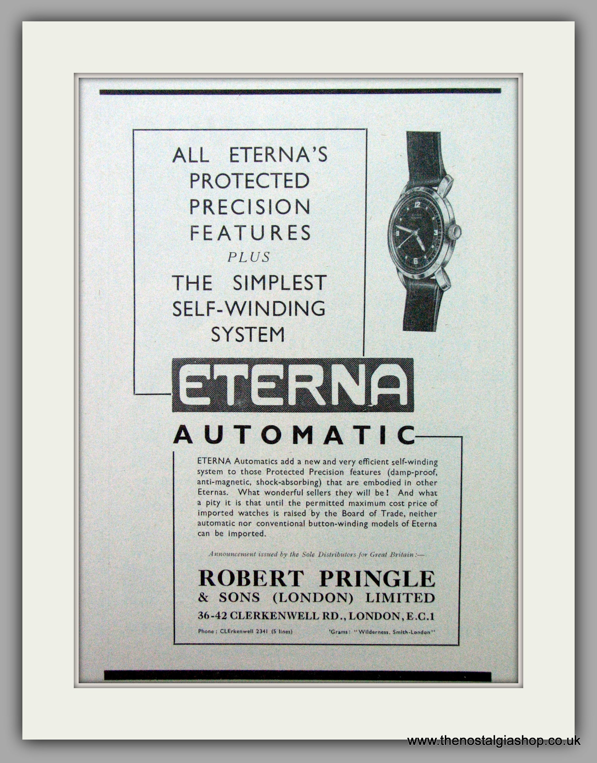 Eterna Watches. Robert Pringle & Sons. Vintage Advert. Original Advert 1946. Presented in cream bevel cut mount with backing card and clear bag. Ready to fit in 14 x 11 inch frame. Want it framing? If so, buy this then go to Frames Available Category. Click to buy on the suitable frame(s) and we will do the rest. All our adverts, unless clearly stated are Originals from the date shown. They make excellent pieces of wall art and stunning gifts. Many are rare and hard to find and once sold, may not be replaced. Remember you are buying a piece of history. Website watermark is not on original.