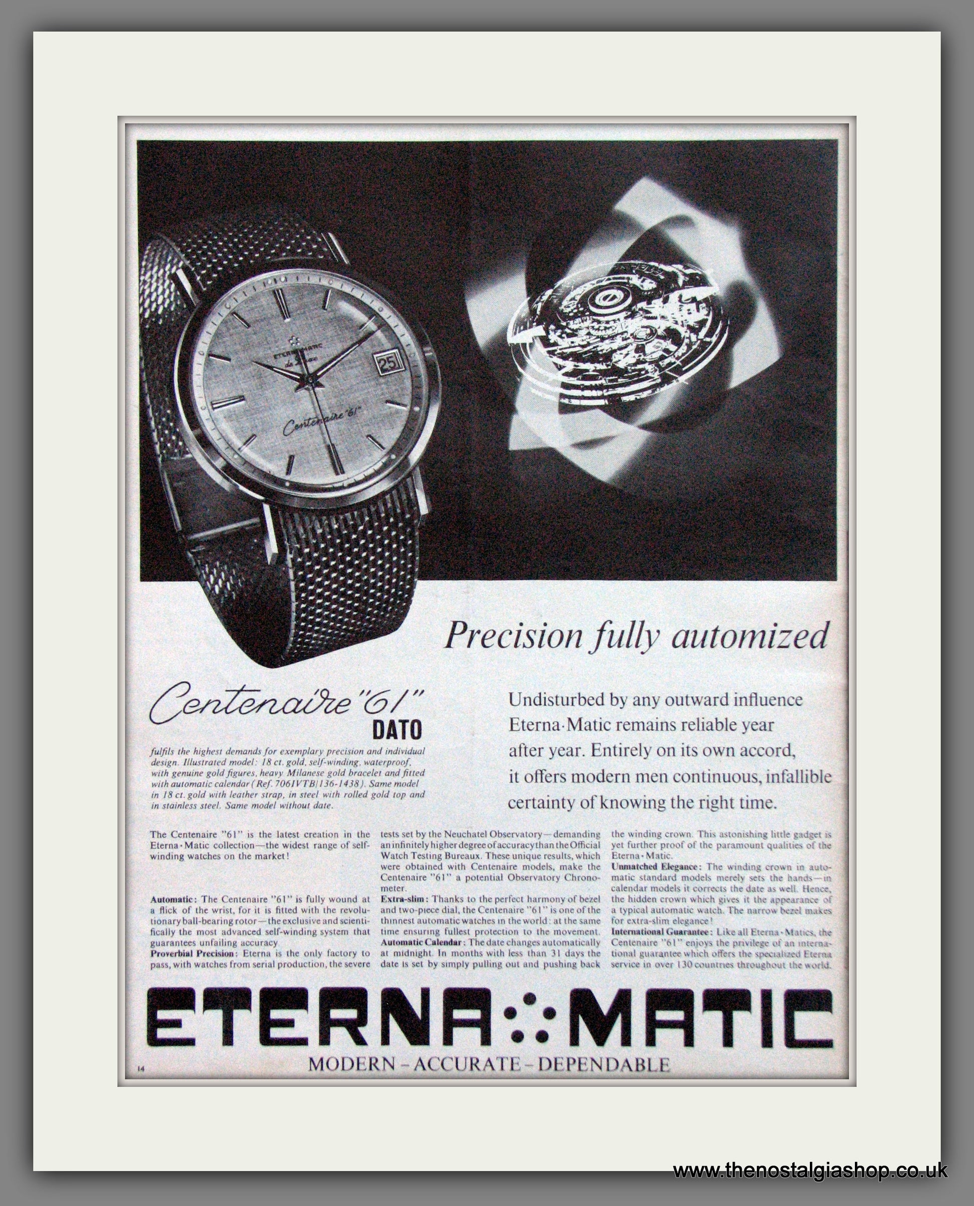Eterna Matic. Centenaire '61. Vintage Advert. This is a large classic Original advert 1964. Presented and supplied in a cream bevel cut mount with backing card and clear bag. Ready to fit in 20 x 16 inch frame. The mounted advert will be posted via courier and well packed - protected with a sheet of hardboard to keep it rigid. Any questions or inquiries, please get in touch, we are here to help! All our adverts, unless clearly stated are Originals from the date shown. They make excellent pieces of wall art and stunning gifts. Many are rare and hard to find and once sold, may not be replaced. Remember you are buying a piece of history. Website watermark is not on original .