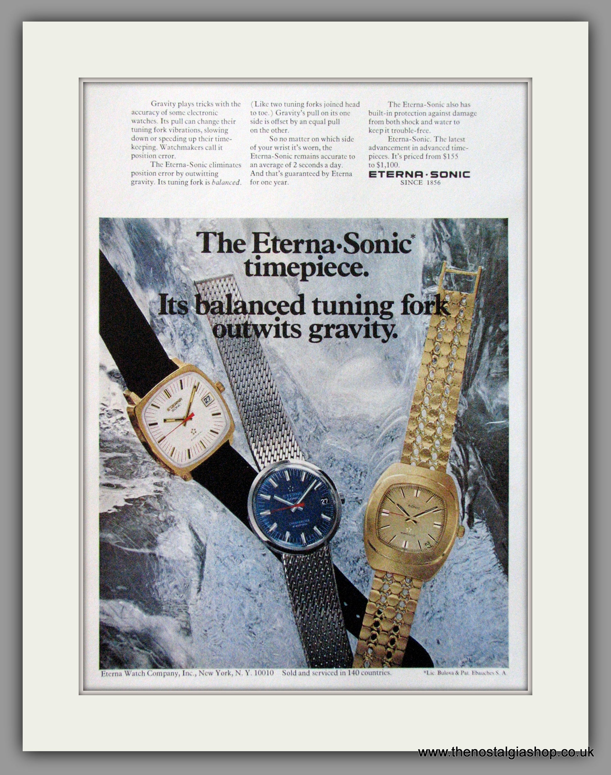 Eterna-Sonic Watch Company Classic original advert 1970. Presented and supplied in a cream bevel cut mount with backing card and clear bag. Ready to fit in 14 x 11 inch frame. Want it framing? If so, buy this then go to Frames Available Category. Click to buy on the suitable frame and we will do the rest. All our adverts, unless clearly stated are Originals from the date shown. They make excellent pieces of wall art and stunning gifts. Many are rare and hard to find and once sold, may not be replaced. Remember you are buying a piece of history. Website watermark is not on original.