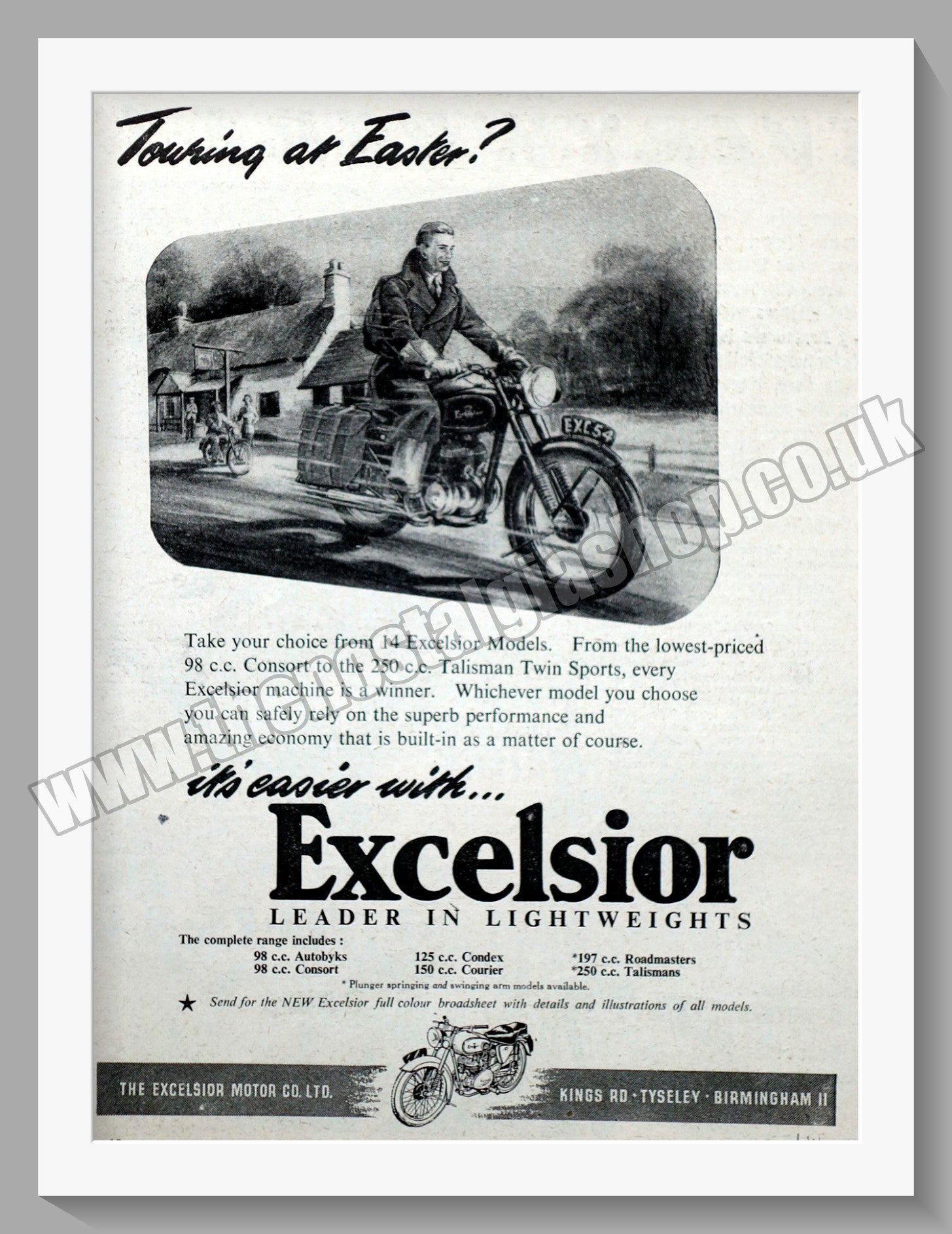 Excelsior Motor Cycle Range. Original advert from 1954. Presented and Supplied in a cream bevel cut mount with backing board and Clear Bag. Made to fit straight into 14x11 inch frame. The perfect gift.- These adverts are all taken from Original publications of the dates stated. They are NOT modern reprints. Many are difficult to get hold of , some are very rare and once sold may not be replaced, Remember, you are buying a piece of historic nostalgia. Lots more adverts available. Please contact us if you don't see the advert you want. Website Watermark is not on the product. Excelsior Motorcycles.