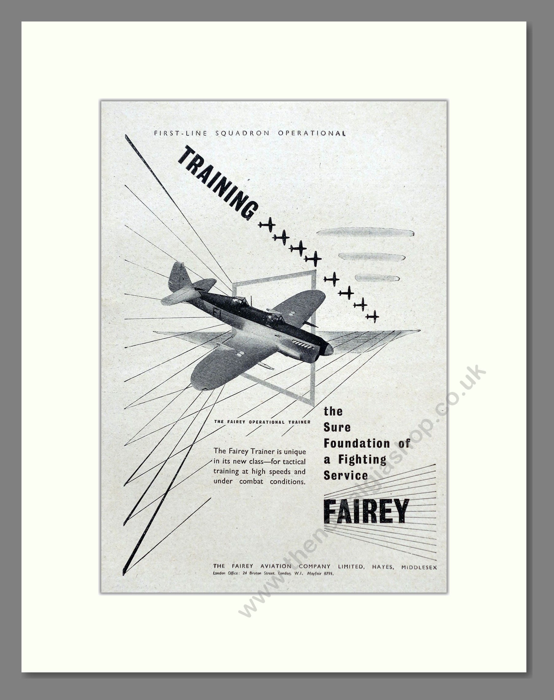 Fairey - Trainer. Vintage Advert. This is a classic original advert from 1947. Presented and supplied in a cream bevel cut mount with backing card and clear bag. Ready to fit in a 14 x 11 inches frame. The mounted advert will be posted via courier and well packed - protected with a sheet of hardboard to keep it rigid. Any questions or enquiries, please get in touch, we are here to help! All our adverts, unless clearly stated are originals from the date shown. They make excellent pieces of wall art and stunning gifts. Many are rare and hard to find and once sold, may not be replaced. Remember you are buying a piece of history. Website watermark is not on original.