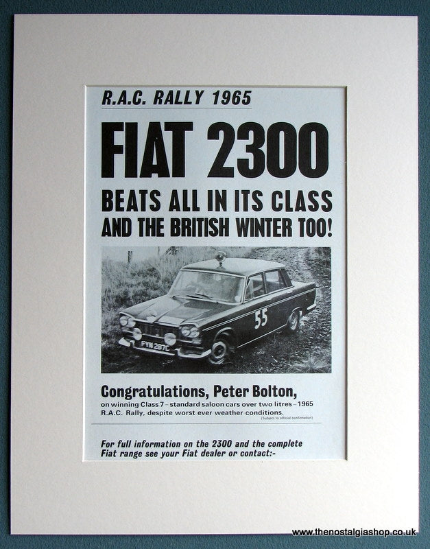 Fiat 2300. Beats all in its class and the British winter too! Classic original advert 1965. Professionally sealed and presented in cream bevel cut mount with backing card. Ready to fit in 14 x 11 inch frame. Want it framing? buy this then go to Frames Available Catagory. Click to buy on the suitable frame and we will do the rest. All our adverts, unless clearly stated are Originals from the date shown They make excellent pieces of wall art and stunning gifts. Many are rare and hard to find and once sold, may not be replaced. Remember you are buying a piece of history. Website watermark is not on original.
