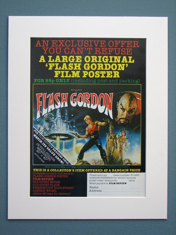 Flash Gordon - 3 adverts Sam Jones, Ornella Muti, Max Von Sydow. Original adverts 1978, also advert for Queen Soundtrack music of the film, also colour advert for original colour poster. You get all 3 adverts - a stunning collection from a classic film. Presented and Supplied in 3 cream bevel cut mounts with backing cards and clear bags. Each is ready to fit in 14 x 11 inch frame. All our adverts, unless clearly stated are Originals from the date shown. They make excellent pieces of wall art and stunning gifts. Many are rare and hard to find and once sold, may not be replaced. Remember you are buying a piece of history.