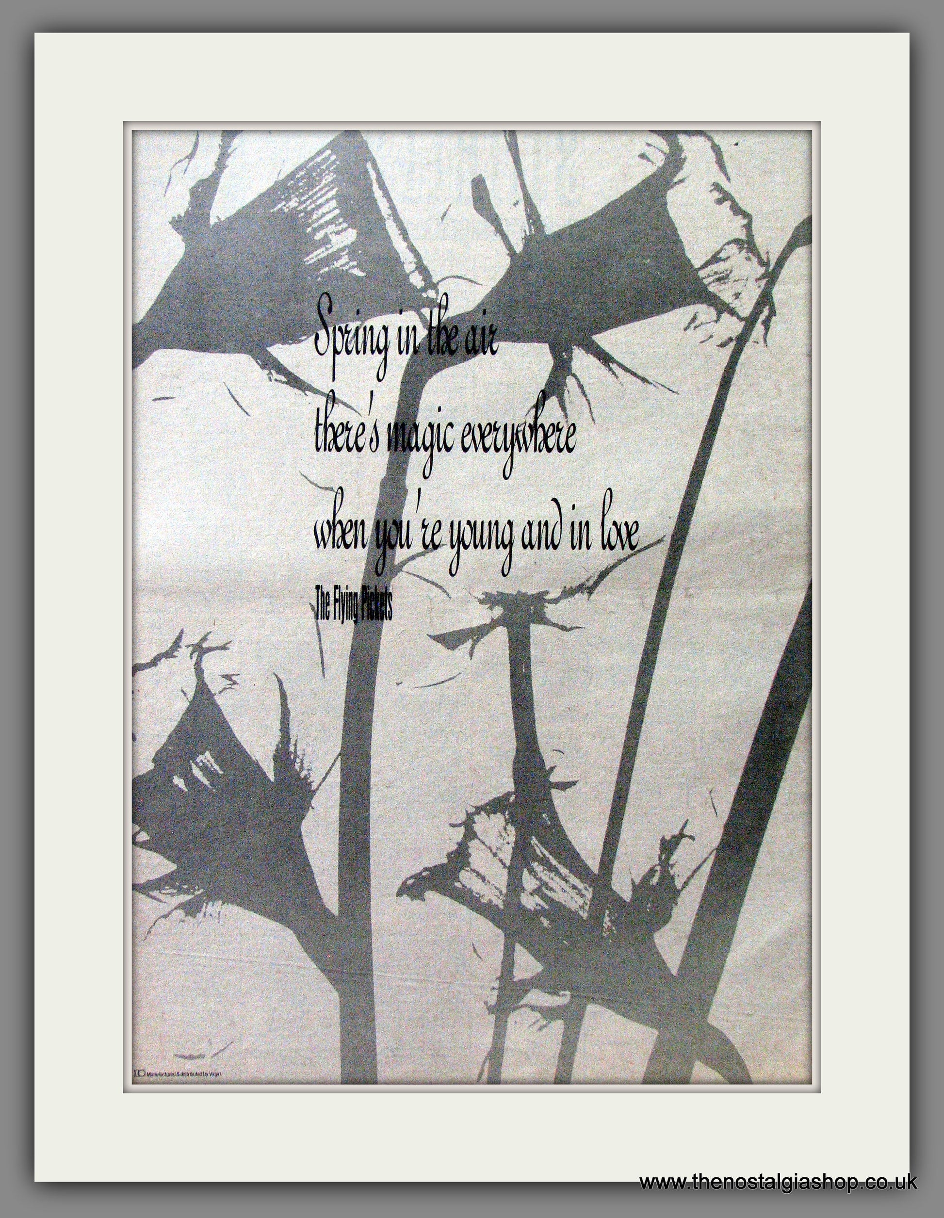 Flying Pickets (The) Young And In Love. Original Advert 1984 (ref AD13079). Presented and supplied in a cream bevel cut mount with backing card and clear bag. Ready to fit in a 20x16 inch frame. The mounted advert will be posted via courier and well packed - protected with a sheet of hardboard to keep it rigid. Any questions or enquiries, please get in touch, we are here to help! All our adverts, unless clearly stated are originals from the date shown. They make excellent pieces of wall art and stunning gifts. Many are rare and hard to find and once sold, may not be replaced. Remember you are buying a piece of history. Website watermark is not on original.