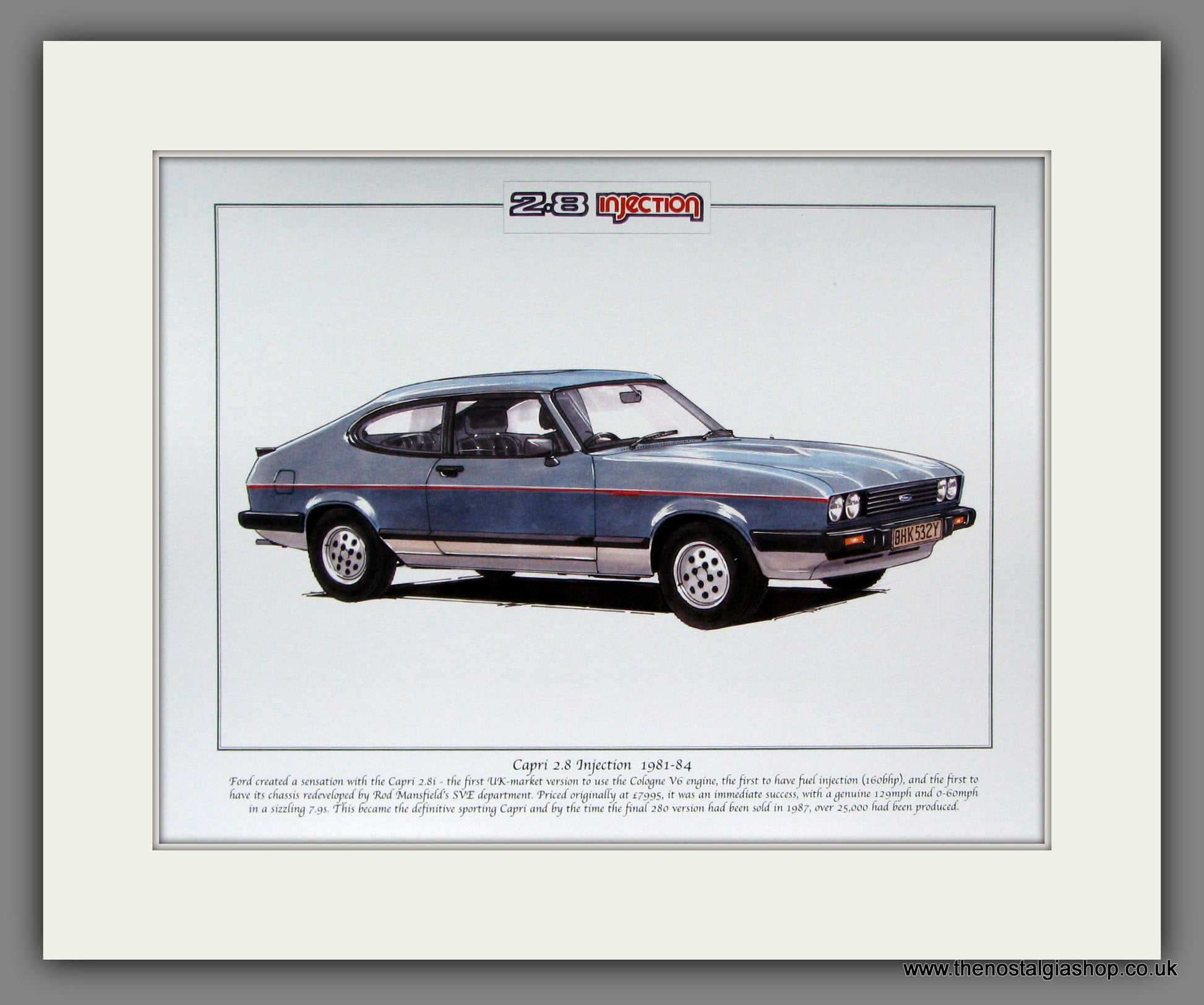 Ford Capri 2.8i Mk3. Beautifully Illustrated print with detailed description of the vehicle. Presented and Supplied in a cream bevel cut mount with backing board and clear bag. The perfect gift. Size of the mount is 14 x 11 inches, it is ready to drop straight in to a frame. Framing option available on this print, Add this print to your shopping basket, then go to 'Frames Available" category, Click to buy the suitable frame. We will frame and post your choice. Free UK postage on orders over £20.00. Website watermarks are not present on the prints. Ford Prints, Ford Art, Classic Fords, Fast Fords, Ford pictures. Ford Clubs,