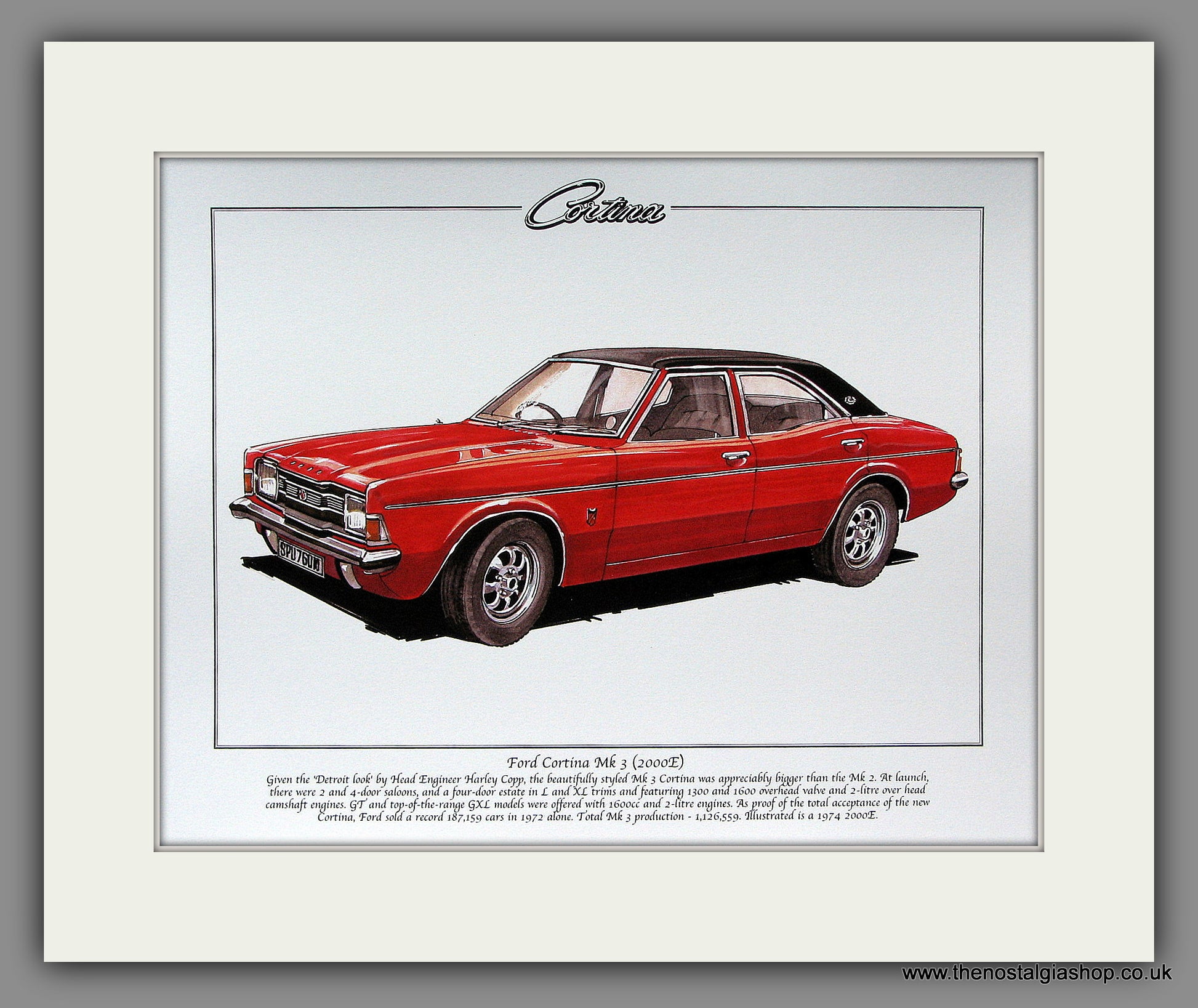 Ford Cortina Mk3 2000E. Beautifully Illustrated print with detailed description of the vehicle. Presented and Supplied in a cream bevel cut mount with backing board and clear bag. The perfect gift. Size of the mount is 14 x 11 inches, it is ready to drop straight in to a frame. Framing option available on this print, Add this print to your shopping basket, then go to 'Frames Available" category, Click to buy the suitable frame. We will frame and post your choice. Free UK postage on orders over £20.00. Website watermarks are not present on the prints. Ford Prints, Ford Art, Classic Fords, Fast Fords, Ford pictures. Ford Clubs,