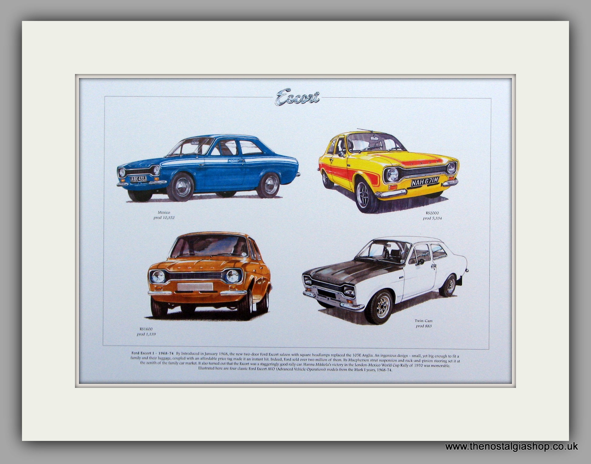 Fords Escort Mk I. 1968 - 1974. Mounted print. Vehicles Shown; Mexico, RS2000, RS1600, Twin-Cam. Presented in cream bevel cut mount with backing board, and clear re-seal bag. Size of the mount is 18 by 14 inches, it is ready to drop straight in to a frame. Items will be well packed for protection.