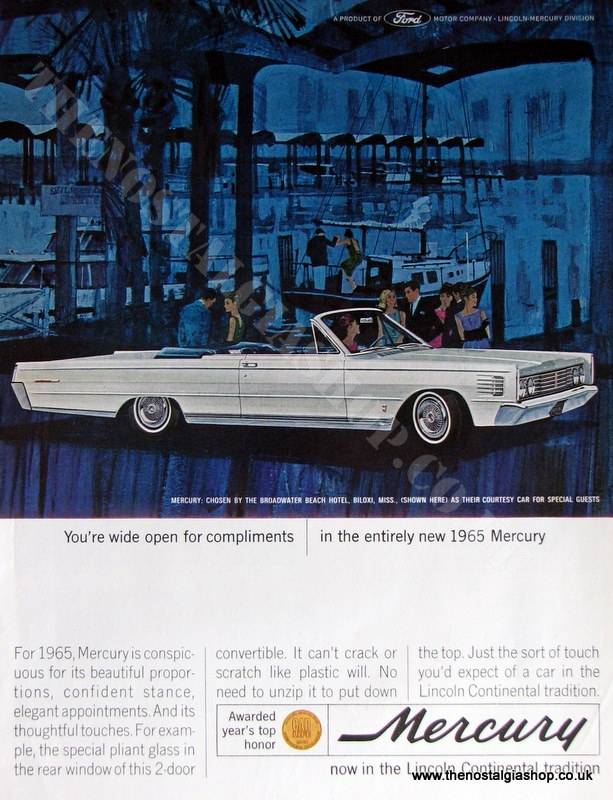 Ford Mercury Cabriolet. You're wide open to complements in the entirely new 1965 Mercury! Classic original advert 1965. This is a large advert - 13.5 x 10.5 inches approx and is sold unmounted Want it framing? If so, buy this then go to Frames Available Catagory. Click to buy on the suitable frame (A3 or larger) and we will mount, frame and post it. All our adverts, unless clearly stated are Originals from the date shown They make excellent pieces of wall art and stunning gifts. Many are rare and hard to find and once sold, may not be replaced. Remember you are buying a piece of history. Website watermarks are not on original.