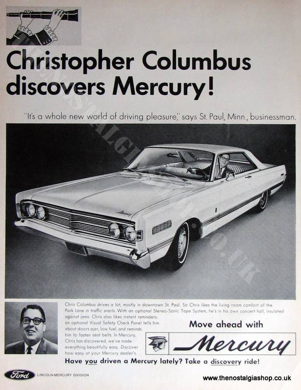 Ford Mercury. Christopher Columbus discovers Mercury! Classic original advert 1966. This is a large advert - 14 x 10.5 inches approx and is sold unmounted Want it framing? If so, buy this then go to Frames Available Catagory. Click to buy on the suitable frame (A3 or larger) and we will mount, frame and post it. All our adverts, unless clearly stated are Originals from the date shown They make excellent pieces of wall art and stunning gifts. Many are rare and hard to find and once sold, may not be replaced. Remember you are buying a piece of history. Website watermarks are not on original.