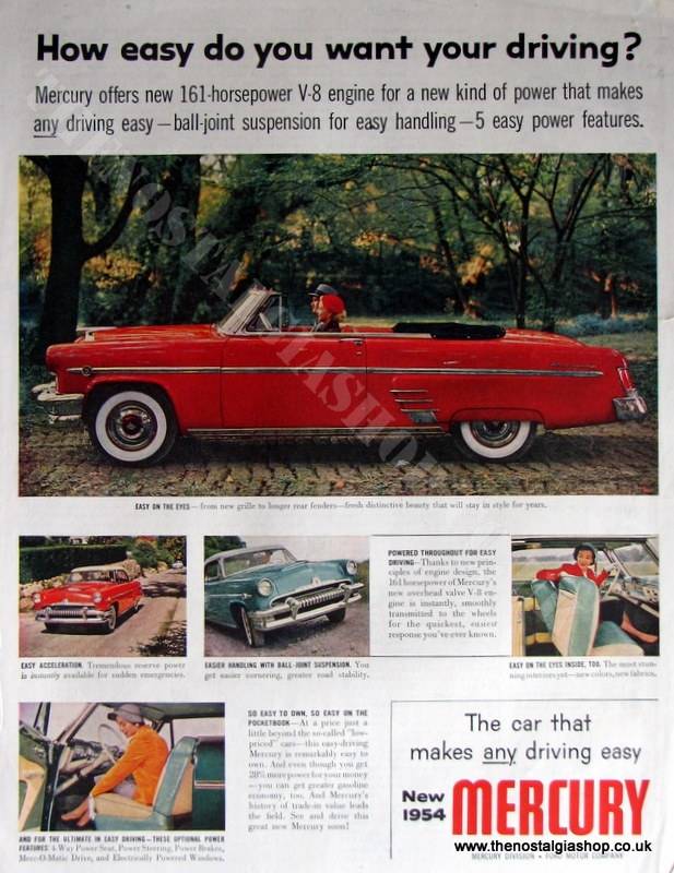 Ford Mercury V8 1954. The car that makes any driving easy...New 1954 Mercury! Classic original advert 1954. This is a large advert - 14 x 10.5 inches approx and is sold unmounted Want it framing? If so, buy this then go to Frames Available Catagory. Click to buy on the suitable frame (A3 or larger) and we will mount, frame and post it. All our adverts, unless clearly stated are Originals from the date shown They make excellent pieces of wall art and stunning gifts. Many are rare and hard to find and once sold, may not be replaced. Remember you are buying a piece of history. Website watermarks are not on original.