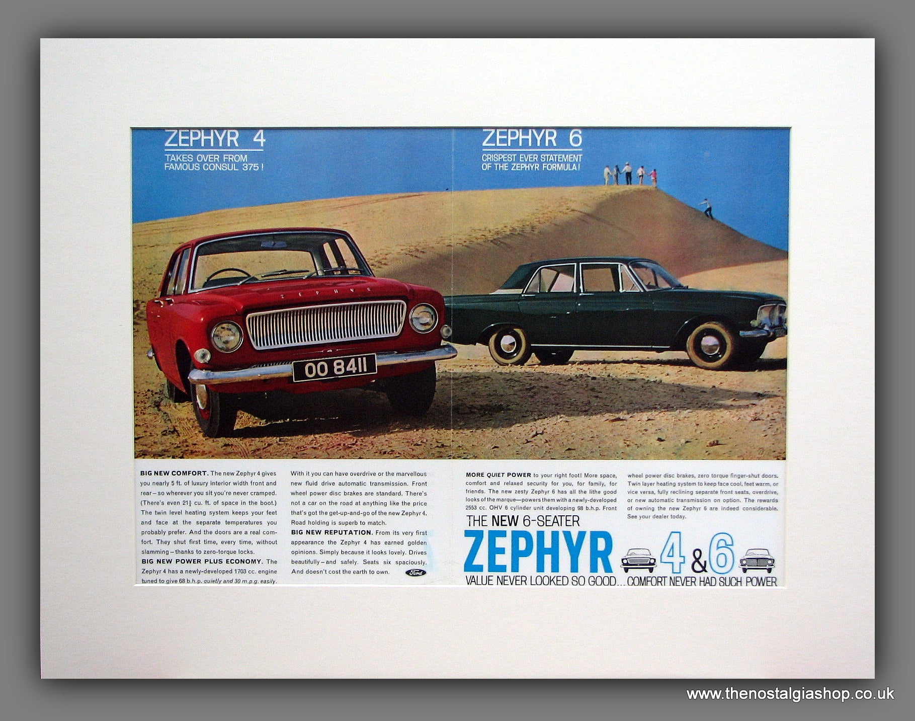 Ford Zephyr 4 & Zephyr 6. Original Advert 1962 (ref AD121M). Presented and supplied in a cream bevel cut mount with backing card and clear bag. Ready to fit in a 20x16 inch frame. The mounted advert will be posted via courier and well packed - protected with a sheet of hardboard to keep it rigid. Any questions or enquiries, please get in touch, we are here to help! All our adverts, unless clearly stated are originals from the date shown. They make excellent pieces of wall art and stunning gifts. Many are rare and hard to find and once sold, may not be replaced. Remember you are buying a piece of history. Website watermark is not on original.